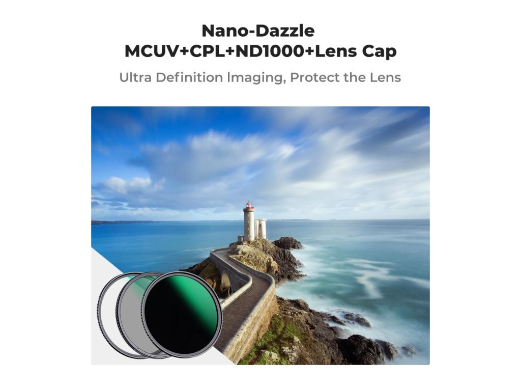 Acest set de filtre include MCUV+CPL+Neutral Denstiy ND1000+ 2 capacuri pentru filtru + 3 lavete de curățare din microfibră.