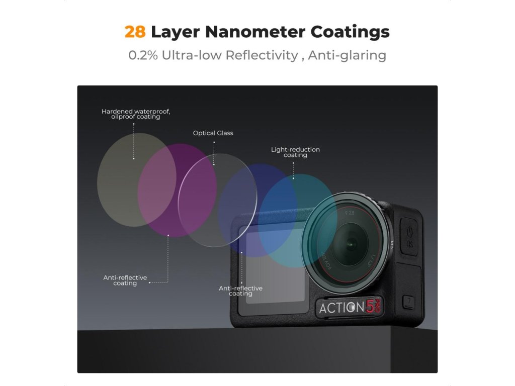 - * 【28 de acoperiri multistrat】Filtrul multistrat reduce la maximum strălucirea și reflexiile, este rezistent la apă, zgârieturi, praf și ulei și protejează obiectivul camerei de acțiune de efectele luminoase.