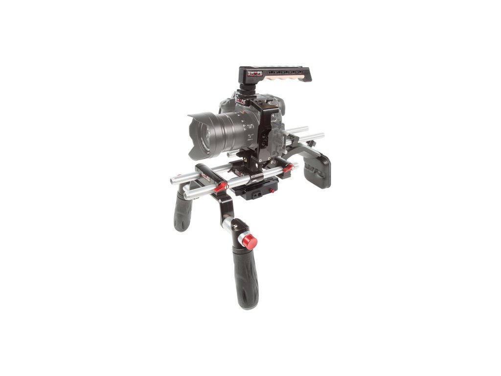 Cușca SHAPE cu sistem de bare ușoare de 15 mm pentru Panasonic GH5 este o altă opțiune fantastică. Dispune de cușcă potrivită, mâner superior REVOLT, placă de eliberare rapidă, sistem Rod Bloc reglabil și o pereche de tije de 10" 15 mm. Cușca asigură o fixare sigură în jurul corpului camerei GH5, previne rotația și oferă o varietate de tije de 1/4" -20 și 3/8 filete accesorii "-16. Camera dvs. este atașată ferm de cușcă, poziția sa din spate de 4" rămâne stabilă cu 1 șurub. și laterale, chiar și atunci când sunt echipate cu o lentilă grea.