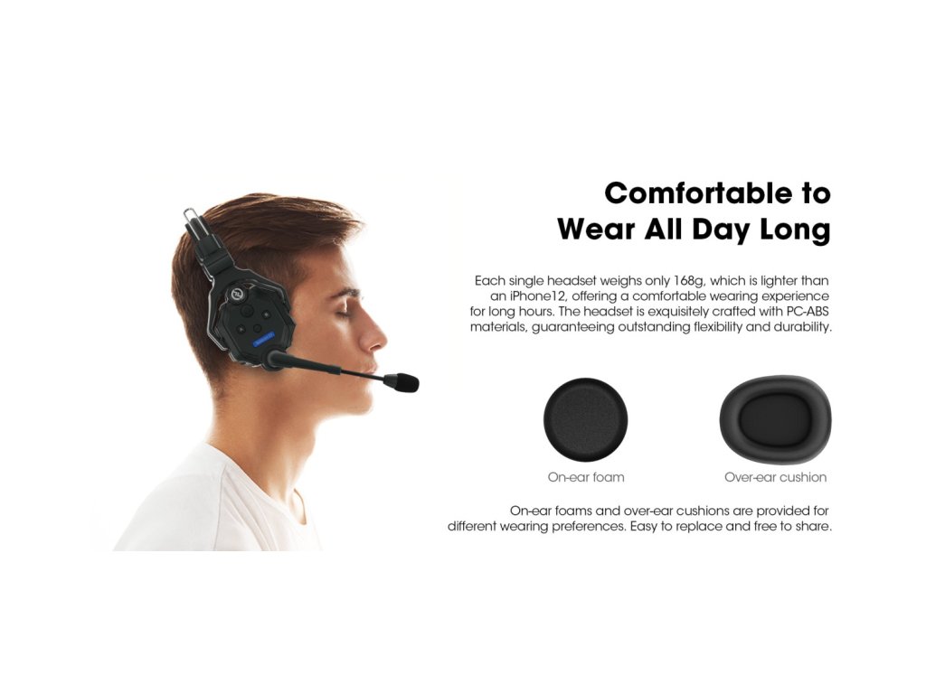Fiecare cască individual cântărește doar 168 g, ceea ce este mai ușor decât iPhone12 și oferă o purtare confortabilă pentru ore lungi. Setul cu cască este perfect realizat din materiale PC-ABS, care garantează o flexibilitate și durabilitate excelente. Fiecare cască de interfon vine cu o baterie de litiu de rezervă pentru o înlocuire convenabilă pe teren, menținând sistemul în funcțiune cu timp de nefuncționare minim.