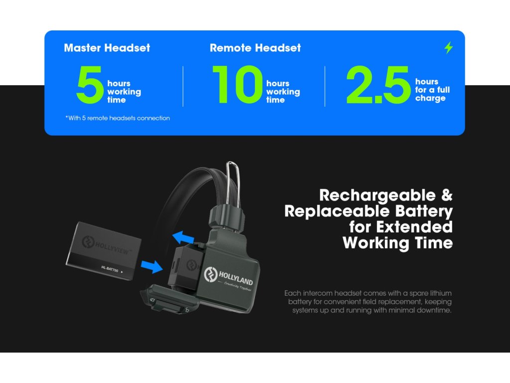 Fiecare cască individual cântărește doar 168 g, ceea ce este mai ușor decât iPhone12 și oferă o purtare confortabilă pentru ore lungi. Setul cu cască este perfect realizat din materiale PC-ABS, care garantează o flexibilitate și durabilitate excelente. Fiecare cască de interfon vine cu o baterie de litiu de rezervă pentru o înlocuire convenabilă pe teren, menținând sistemul în funcțiune cu timp de nefuncționare minim.
