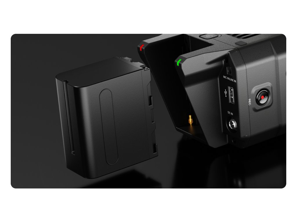 Cu o baterie externă NP-F și opțiuni de alimentare DC, puteți transmite continuu oriunde vă duce călătoria dvs. creativă.