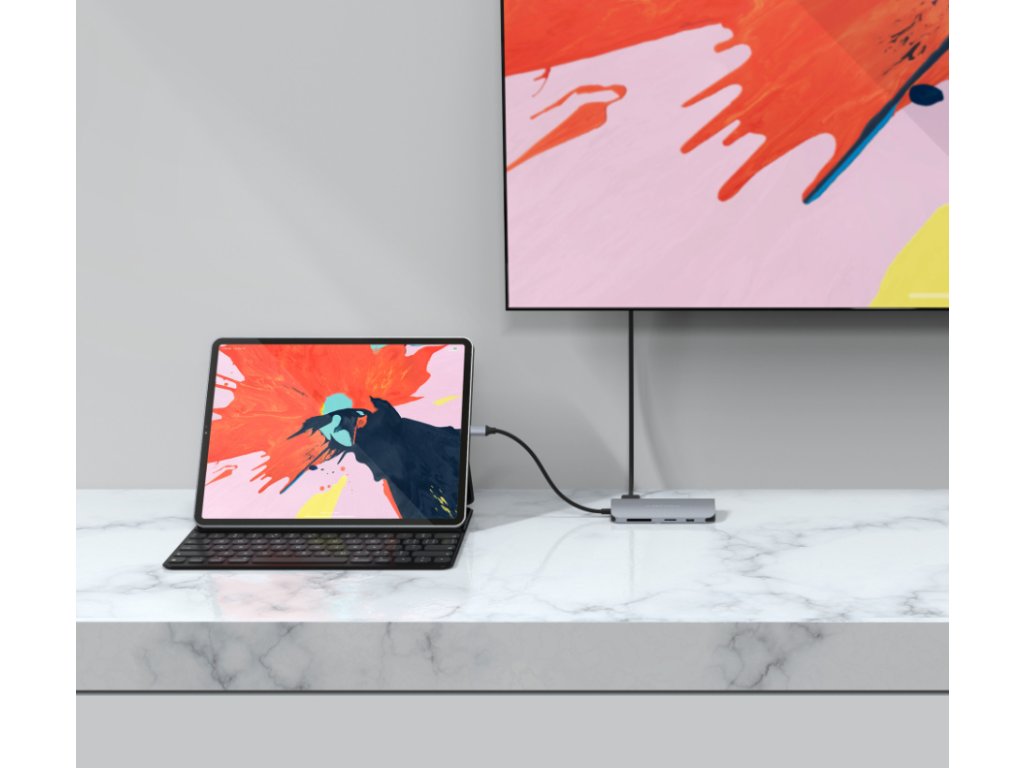 Hub HyperDrive Power perfectremediază lipsa de porturi pe noile iPad-uri și MacBook-uri. Nu numai că vă permite să conectați mai mulți conectori, ci șiCarduri MicroSD și SD cu transfer de 104 MB/s. Datorită cablului suficient de lung, iPad-ul sau tableta plasate în suport nu domină în timpul lucrului.Apoi vă conectați la cele 3 porturi de mare vitezăDispozitivele USB-A și transferați date la o viteză de 5 Gb/s. Îl vei aprecia în locuri fără acces la Wi-FiGigabit Ethernet.