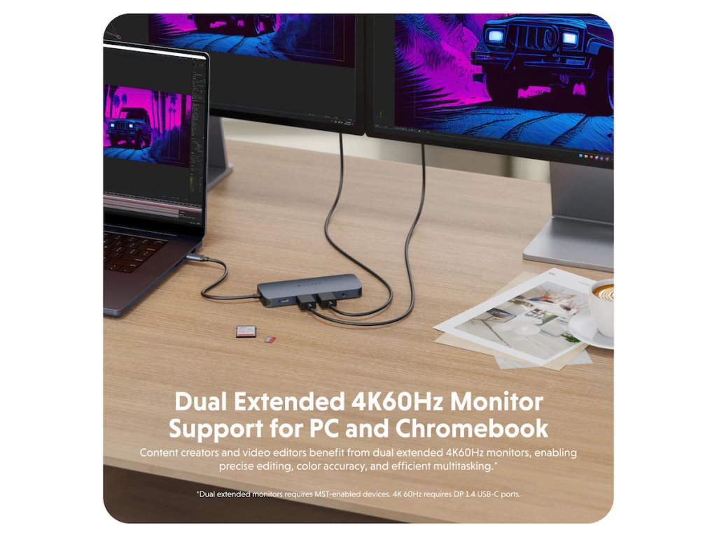 Hyper EcoSmart™ Gen.2 oferă tot ce aveți nevoie pentru a lucra pe deplin pe cel mai recent MacBook Pro sau PC Windows. Îți extinde portul lateral unic la până la 11 conectori, care sunt dominați de două porturi USB-A care permit alimentarea prin trecere și viteze complete de transfer de date de până la 10 Gbps și 5 Gbps, sau conectează două monitoare externe. Puteți încărca MacBook-ul și conecta, de exemplu, 2 monitoare în același timp. Alte echipamente includ 2 x USB-C 10 Gbps, micro SD 312 MB/s, SD 312 MB/s, Gigabit-Ethernet, 3,5 mm Audio Jack Combo, USB-C Power Delivery 140 W PD 3.1.Suport extins pentru monitor 4K 60Hz pentru Mac, PC și Chromebook