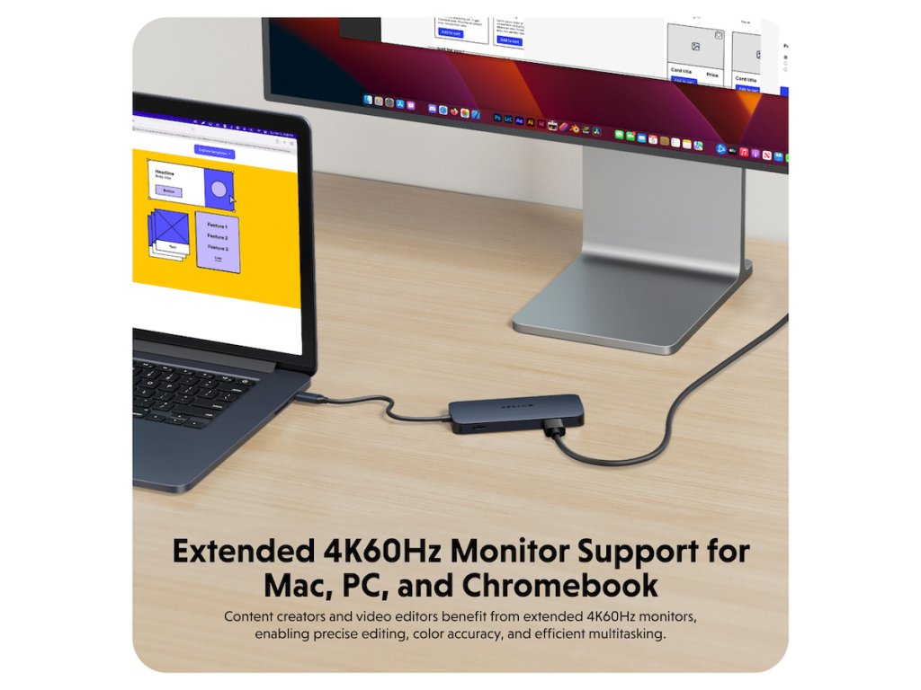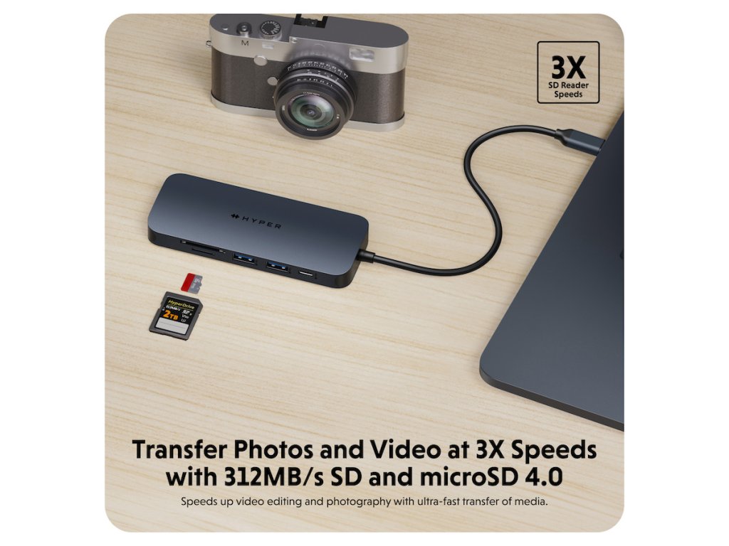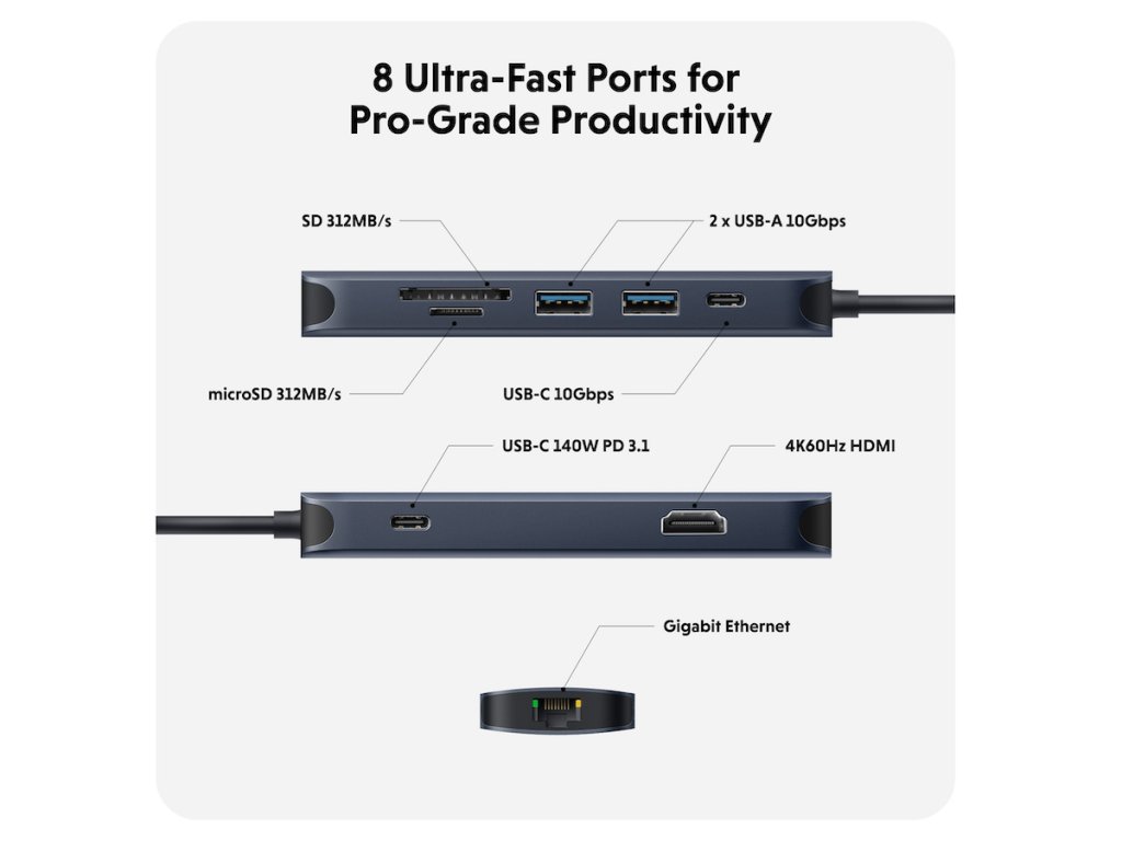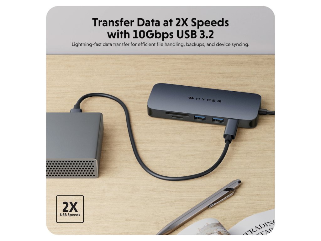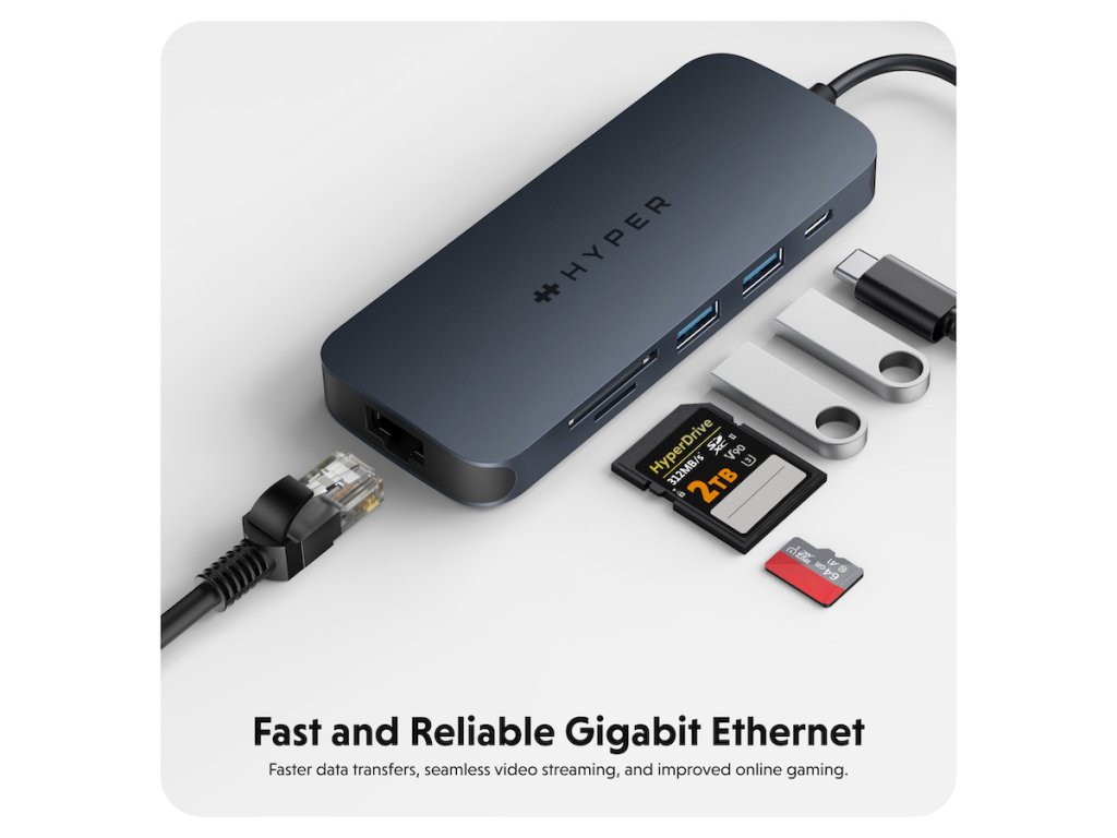 HyperDrive EcoSmart™ Gen.2 oferă tot ce aveți nevoie pentru a lucra pe deplin pe cel mai recent MacBook Pro sau PC Windows. Îți extinde portul unic lateral la opt conectori, care sunt dominați de două porturi USB-A care permit alimentarea prin trecere și viteză completă de transfer de date de până la 10 Gbps sau pentru a conecta un ecran Thunderbolt 5K. Puteți încărca MacBook-ul și conectați un monitor extern în același timp. De asemenea, aveți un port HDMI, USB-C Power Delivery (140 W PD 3.1), USB-C 10 Gbps USB 3.2, un cititor de carduri SD și micro SD și, mai ales, Gigabit Ethernet.Suport extins pentru monitoare 4K 60 Hz pentru Mac, PC și Chromebook