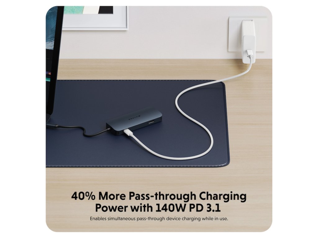 Alimentați și încărcați-vă dispozitivele cu încărcătoare PD 3.1* de până la 140 W în timp ce utilizați hub-ul, asigurând o productivitate neîntreruptă, ideală pentru dispozitivele care consumă energie și profesioniștii ocupați din mers.Sustenabilitate Hyper EcoSmart™ fără compromisuri