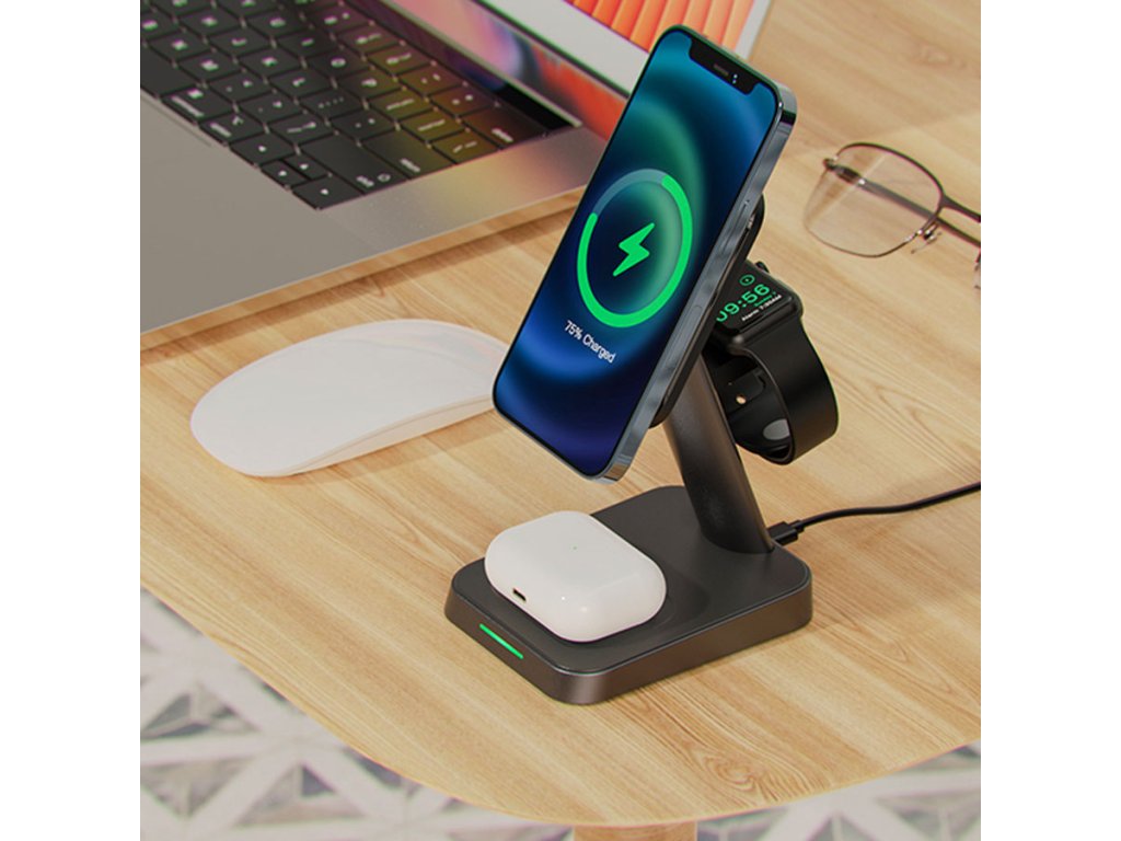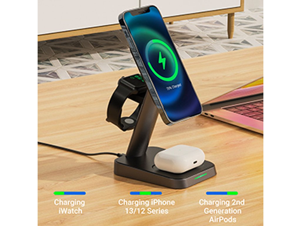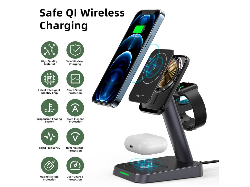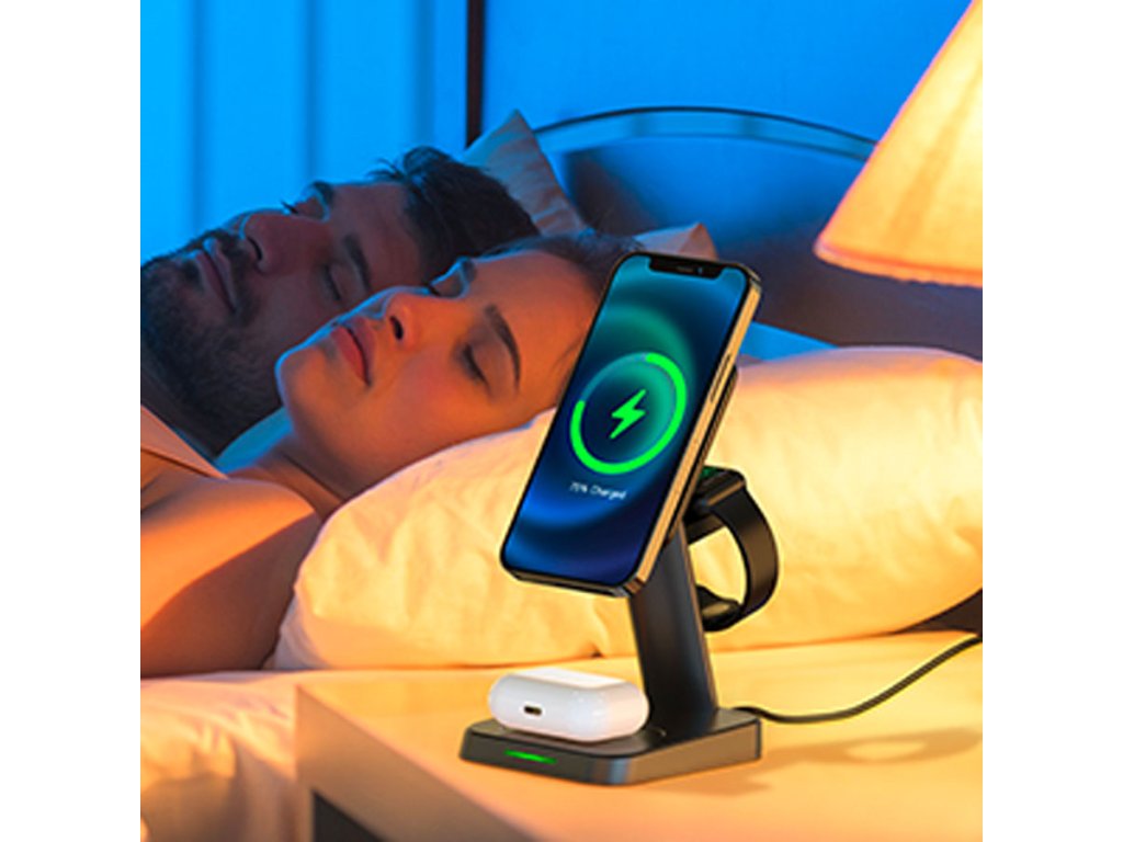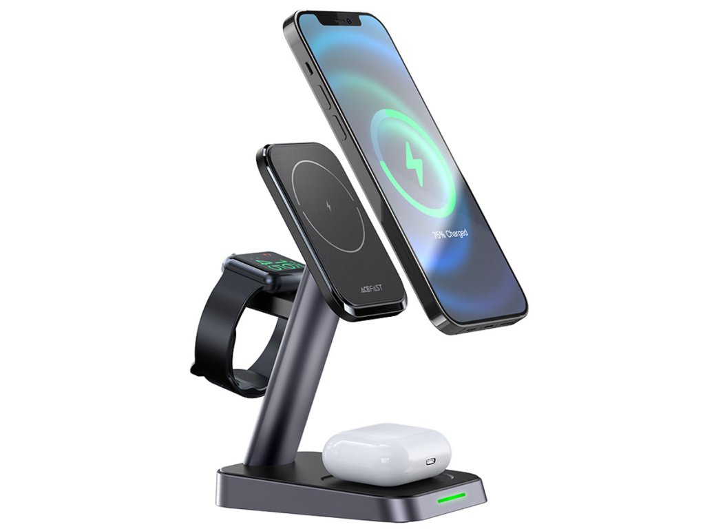 Timpul este cea mai scumpă marfă în zilele noastre, așa că de ce să-l irosești în fiecare zi cu un lucru atât de banal precum încărcarea? Dar așteptarea s-a terminat! Acefast prezintă noul său încărcător cu careputeți furniza suc la 3 dispozitive simultan. Acest sistem sofisticat își poate face treabaperformanță maximă să-i stricați pe toți cei respectabili15 W.Panoul frontal de încărcare reîncarcă bateria iPhone-ului tăucu o putere de 7,5 W,suportul de încărcare pentru căști fără fir duce până la 5W, iar atașamentul pentru ceasul inteligent montat în spate până la 2,5W. Panoul frontal poate fi folosit pentruîncărcarea telefonatât în poziție verticală cât și orizontală. Acest lucru este util, de exemplu, atunci când aveți o conferință video de lucru sau doriți doar să vă relaxați în timp ce vizionați videoclipuri. Totul va călca pe fire -câmpul magnetic al încărcătorului este închis, astfel încât semnalul dispozitivului nu va fi afectat în niciun fel.Alege înainte de fiecare încărcaresmartphone-ul din carcasa nu este necesar, dacă ambalajul nu este mai gros de 6 mm. Tot ce trebuie să faceți este să îndepărtați toate obiectele metalice sau atașamentele magnetice de pe acesta și nimic nu împiedică pornirea încărcării rapide fără fir!