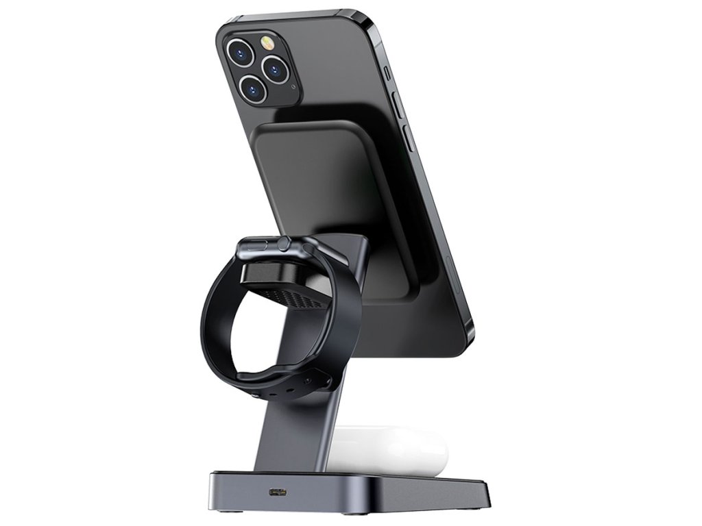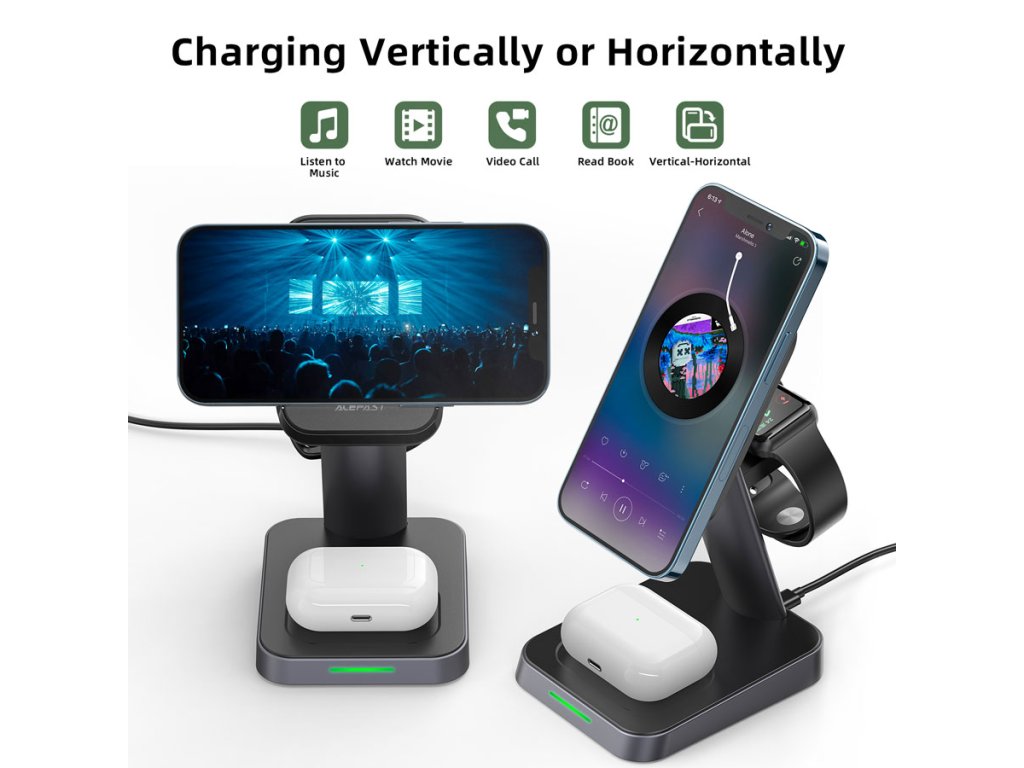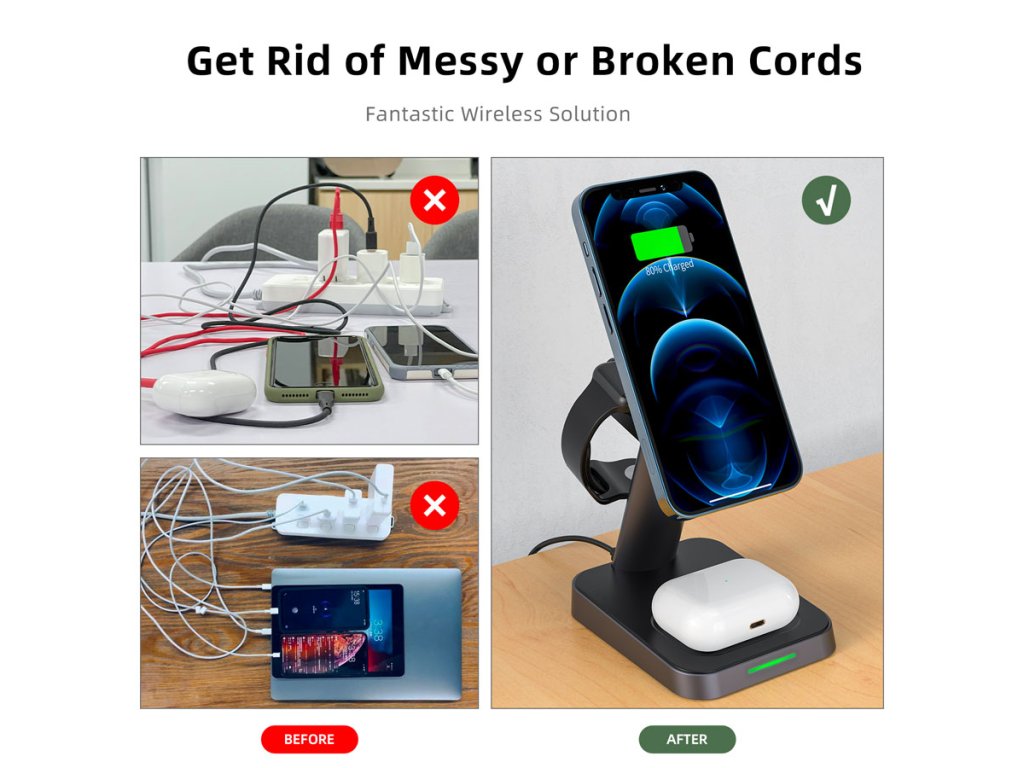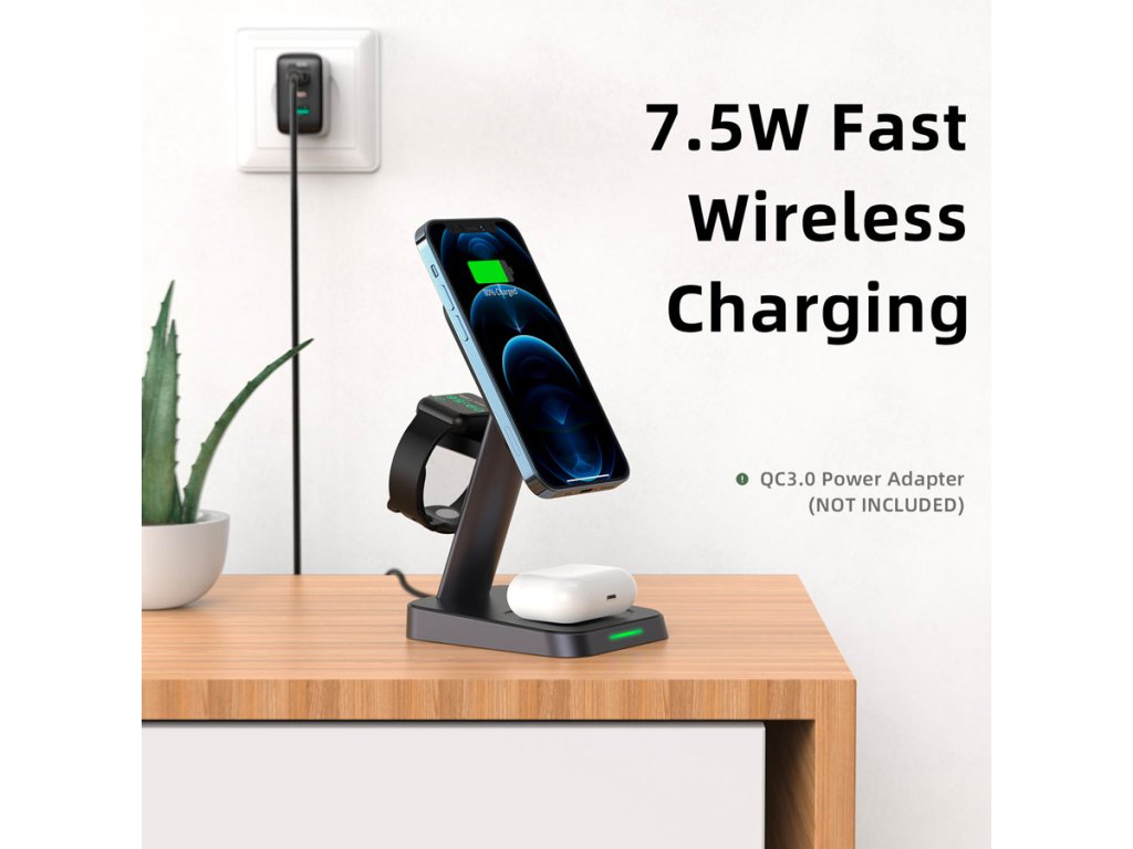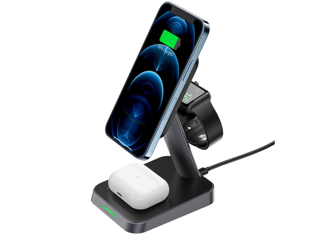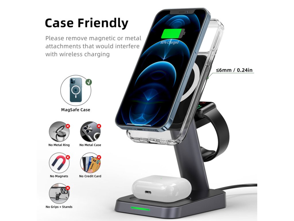 Timpul este cea mai scumpă marfă în zilele noastre, așa că de ce să-l irosești în fiecare zi cu un lucru atât de banal precum încărcarea? Dar așteptarea s-a terminat! Acefast prezintă noul său încărcător cu careputeți furniza suc la 3 dispozitive simultan. Acest sistem sofisticat își poate face treabaperformanță maximă să-i stricați pe toți cei respectabili15 W.Panoul frontal de încărcare reîncarcă bateria iPhone-ului tăucu o putere de 7,5 W,suportul de încărcare pentru căști fără fir duce până la 5W, iar atașamentul pentru ceasul inteligent montat în spate până la 2,5W. Panoul frontal poate fi folosit pentruîncărcarea telefonatât în poziție verticală cât și orizontală. Acest lucru este util, de exemplu, atunci când aveți o conferință video de lucru sau doriți doar să vă relaxați în timp ce vizionați videoclipuri. Totul va călca pe fire -câmpul magnetic al încărcătorului este închis, astfel încât semnalul dispozitivului nu va fi afectat în niciun fel.Alege înainte de fiecare încărcaresmartphone-ul din carcasa nu este necesar, dacă ambalajul nu este mai gros de 6 mm. Tot ce trebuie să faceți este să îndepărtați toate obiectele metalice sau atașamentele magnetice de pe acesta și nimic nu împiedică pornirea încărcării rapide fără fir!