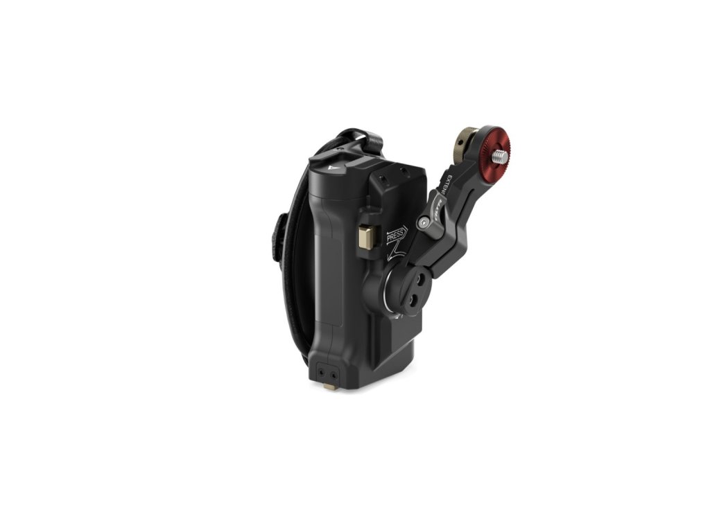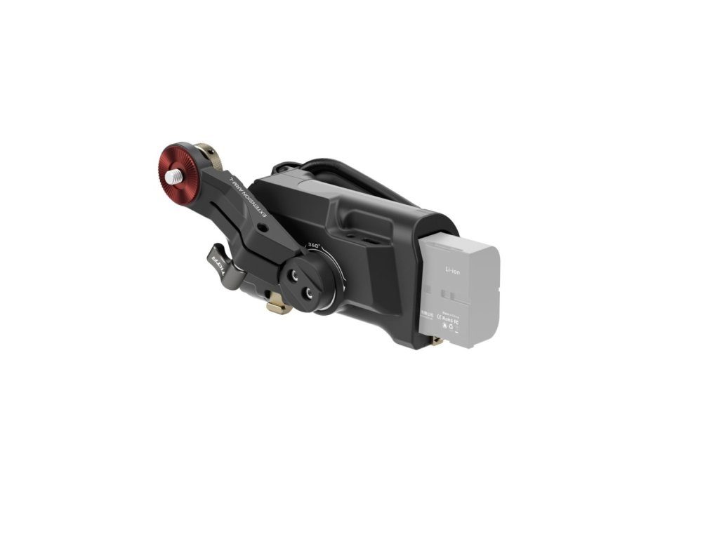 Acest mâner avansat se fixează pe partea dreaptă a cuștilor de înclinare a camerei. Portul pentru baterie din partea de jos a mânerului vă permite să utilizați bateria Sony F570 pentru a alimenta diverse accesorii prin intermediul ieșirilor de alimentare de 8V USB-C și 12V DC.