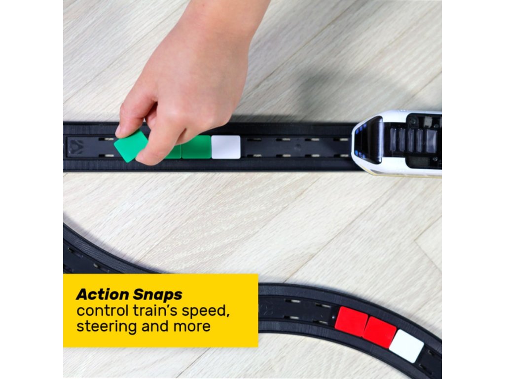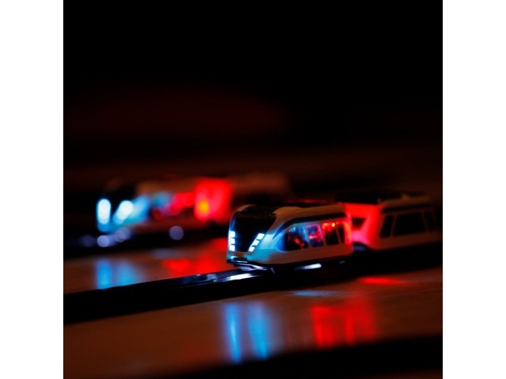 O pistă care nu obosește niciodată. Șinele Intelino sunt ușor de asamblat și cu două fețe, astfel încât să construiți o cale diferită de fiecare dată. |