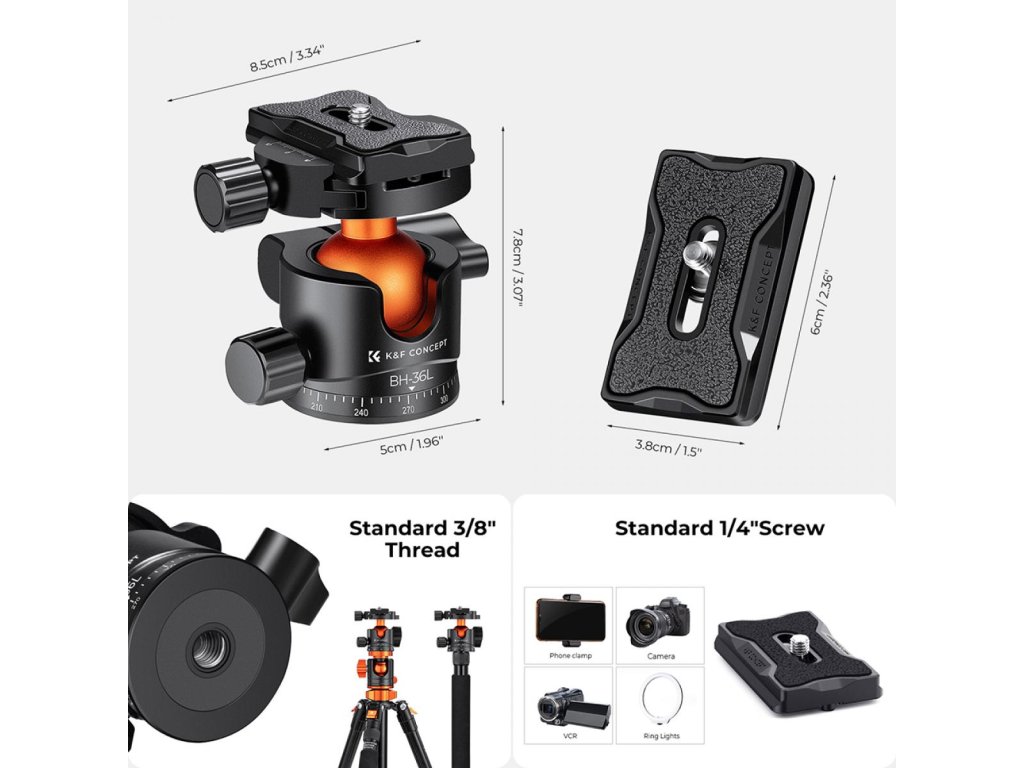 - * Compatibilitate ridicată: placa de săniu rapidă de 1/4 inch este potrivită pentru camerele DSLR și camerele video, orificiul pentru șuruburi de 3/8 inch este pentru atașarea trepiedului, monopiedului, glisorului și a altor suporturi.