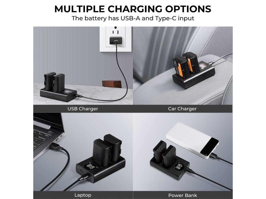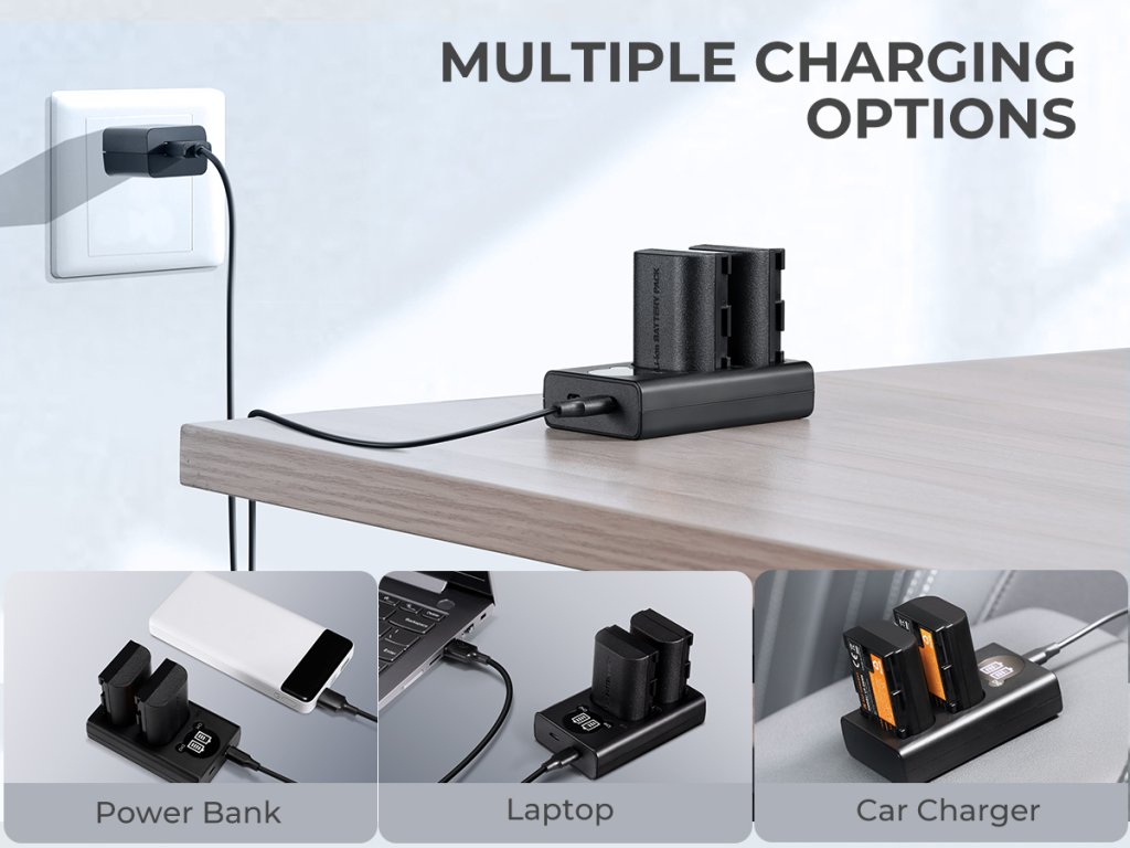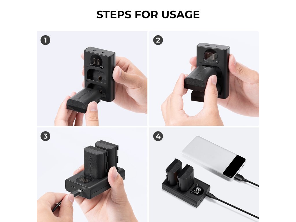 * ?Încărcare inteligentă? Încărcătorul dublu LCD afișează cu precizie starea de încărcare a bateriei, procesul de încărcare folosind un cip inteligent pentru a proteja mai bine bateria; portul de încărcare cu două sloturi poate încărca rapid două baterii în același timp, ceea ce vă economisește mult timp, este cea mai bună alegere pentru călătorii.