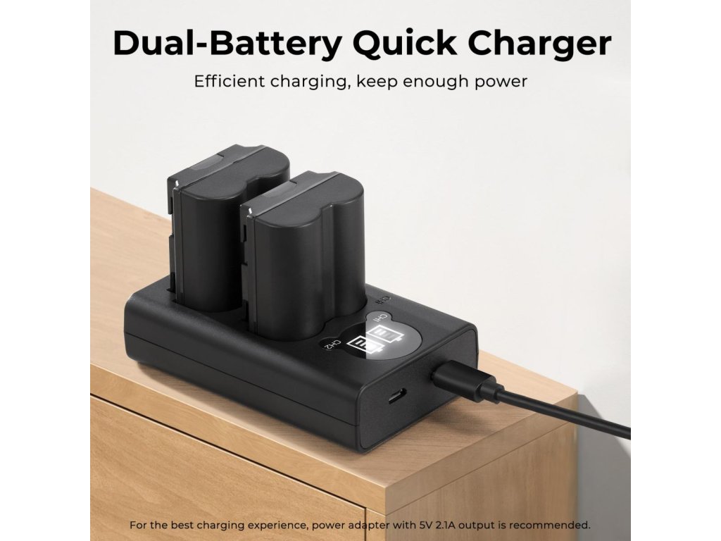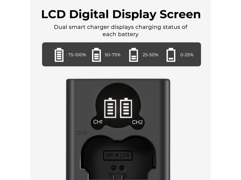 - * ? LCD inteligent? Intrare: 5V/2.1A, design dual slot, poate încărca două baterii NP-W235 în același timp. După ce porniți încărcătorul, puteți înțelege progresul de încărcare al fiecărei baterii pe ecranul LCD