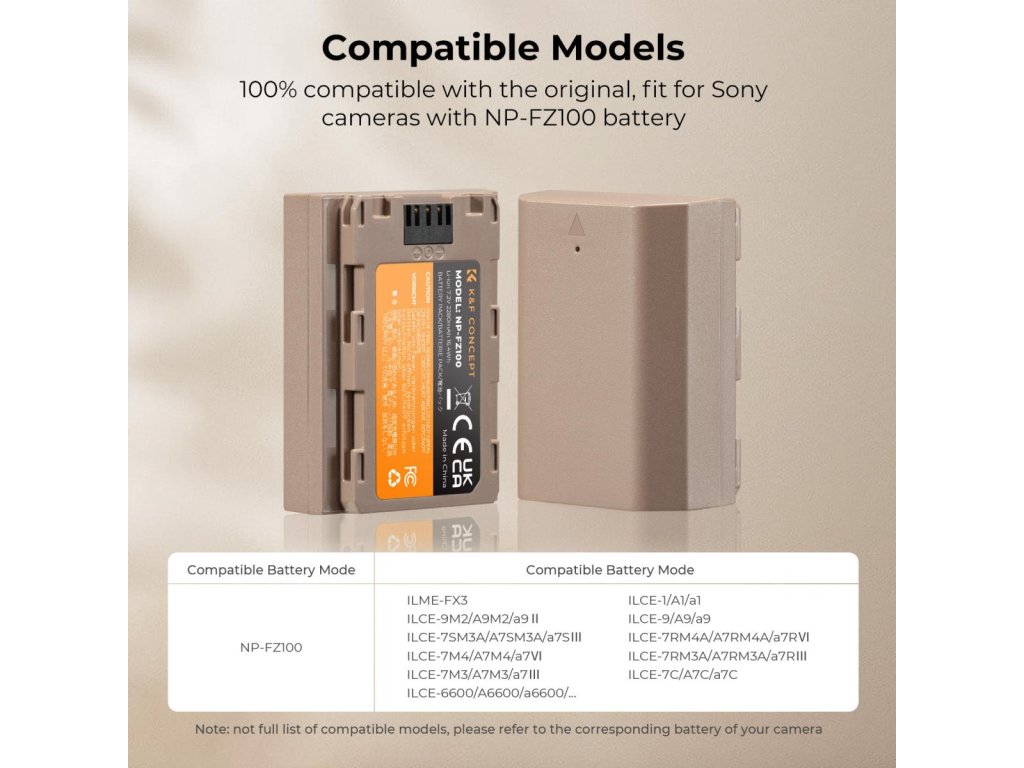 Baterie de schimb NP-FZ100, aceasta este perfect compatibilă cu camerele ZV-E1, FX3, FX30, A1, A9, A9 II, A7R III, A7R IV, A7R V, A7S III, A7 III, A7 IV, A6600, A7C. Protecții multiple de siguranță, cum ar fi protecția la supratensiune, protecția la supratensiune etc.