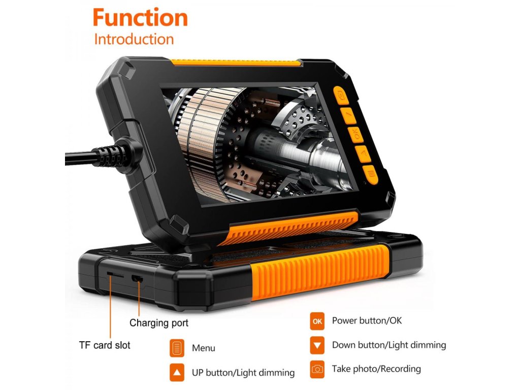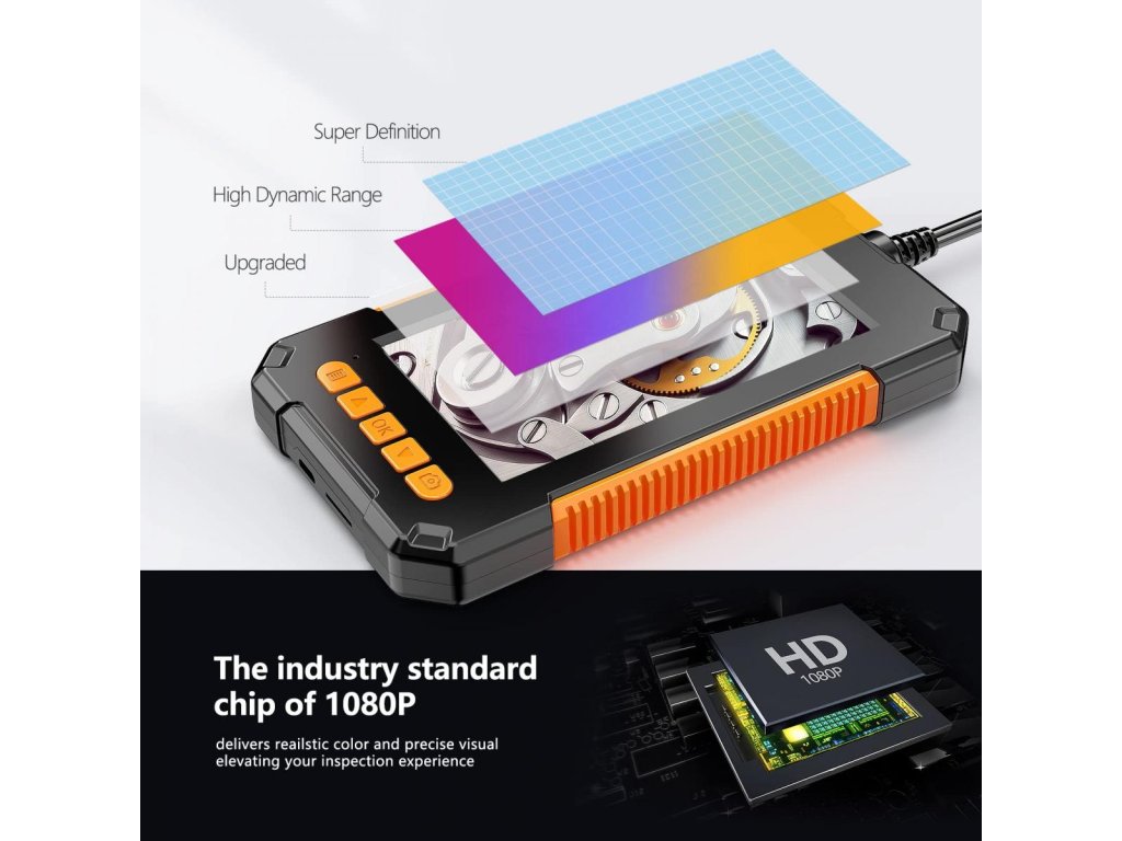 Endoscop HD 1080P. Acest endoscop industrial este echipat cu un afișaj full color HD de 4,3 inchi și senzori avansați pentru a oferi imagini și videoclipuri clare cu rezoluție de 1920 x 1080P pixeli, suport pentru realizarea de fotografii și înregistrarea videoclipurilor, card TF de până la 32G (nu este inclus) puteți stocați imagini și videoclipuri, permițându-vă să vizualizați fotografii și videoclipuri de înaltă definiție în orice moment.