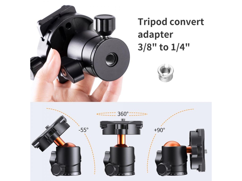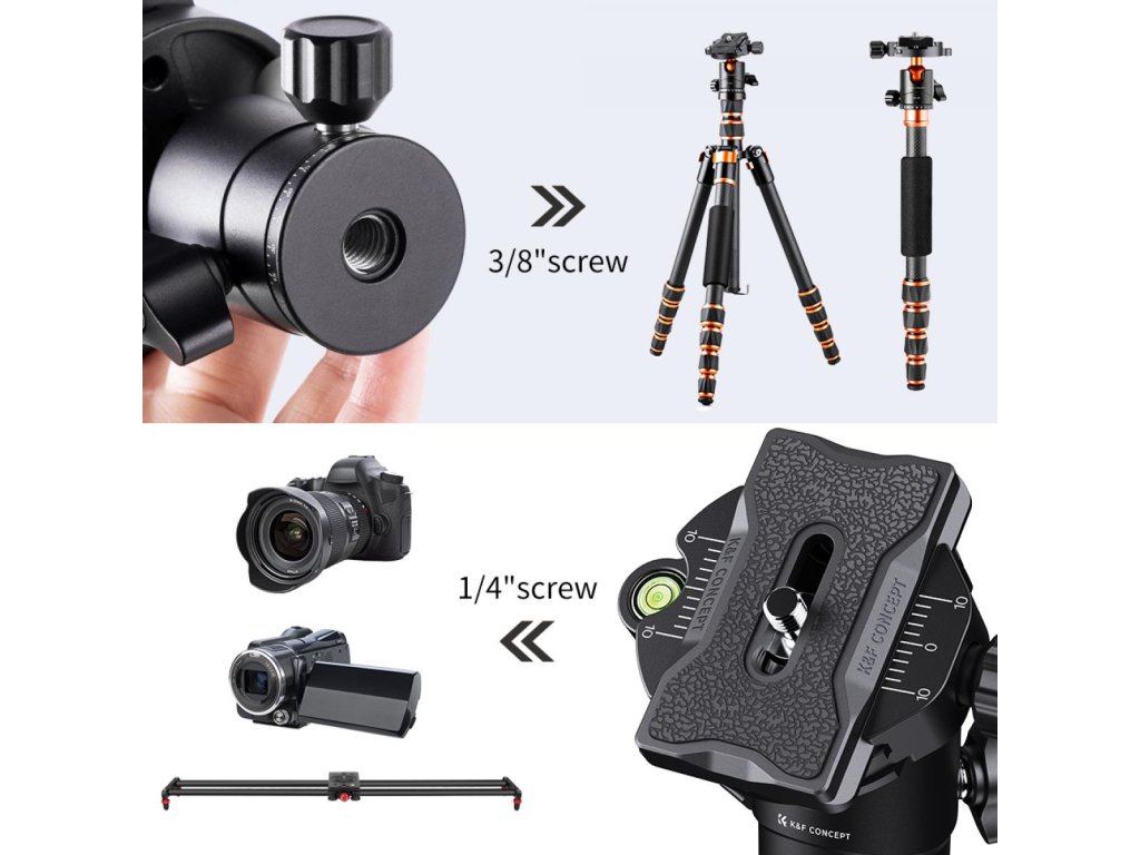 - * ?Compatibilitate ridicată? Cu filet de 1/4" și placă de eliberare rapidă detașabilă, potrivită pentru toate camerele SLR. Orificiul de jos pentru șuruburi 3/8 poate fi folosit pentru a atașa capul trepiedului la un trepied, monopied sau glisor de cameră. Acest lucru facilitează rezolvarea problemelor dvs. mici probleme Orificiu de jos pentru șurubul 3/8 pentru atașarea capului trepiedului la un trepied, monopied sau glisor de cameră.