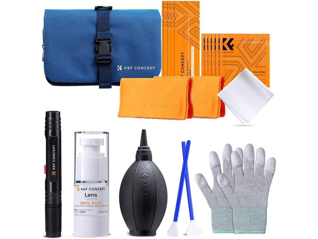 Kit de curățare a camerei profesionale: stilou de curățare + jet de aer + lichid de curățare + tampon de curățare senzor APS-C de 16 mm*2 + tampon de curățare senzor APS full-frame de 24 mm*8 + cârpă mare de curățare*2 + cârpă mică de aspirare*6 + mănuși antistatice* 1 + sac de depozitare *1
