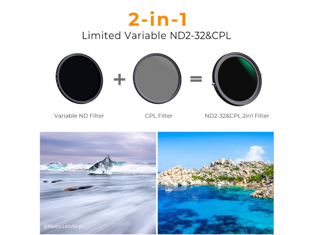 Filtru ND & CPL 2 în 1. Un filtru are atât funcție CPL, cât și funcție variabilă de filtru ND, economisiți timp pentru a schimba două filtre; nu numai că poate reduce cantitatea de lumină care intră în lentilă, dar poate și întuneca cerul și gestionează reflexiile în același timp.