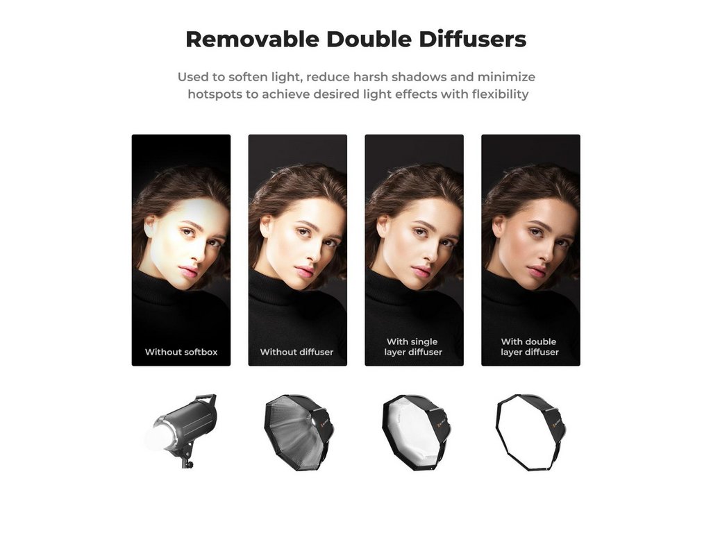 - Softbox octogonal premium: Interiorul argintiu îmbunătățește reflexia luminii, păstrând în același timp culorile adevărate, asigurându-vă că subiecții sunt frumos iluminați. Include un difuzor și o grilă pentru a reduce strălucirea și pentru a crea o soluție de iluminare ușoară și portabilă.