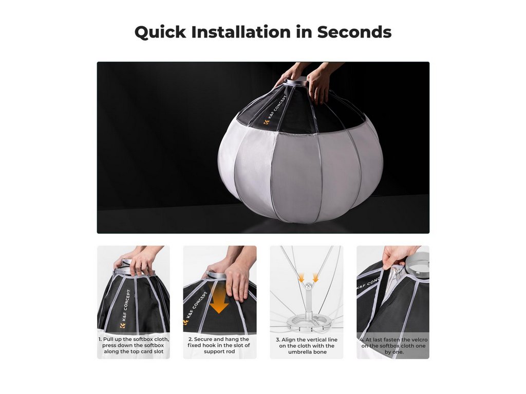 Cutia de lumină moale K&F 85CM Lantern este concepută pentru fotografi și realizatorii de film care au nevoie de soluții de iluminare versatile și eficiente. Designul său sferic oferă o lumină moale omnidirecțională de 360°, făcându-l ideal pentru utilizarea în studio, răspândind uniform lumina cu un unghi al fasciculului de 270°. Această casetă soft cu lampă este ideală pentru a crea o lumină moale și uniformă pe o suprafață largă folosind o singură sursă de lumină.