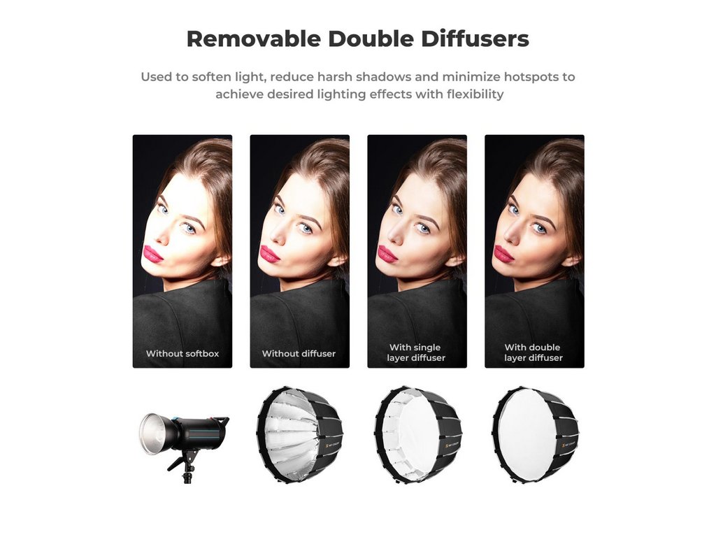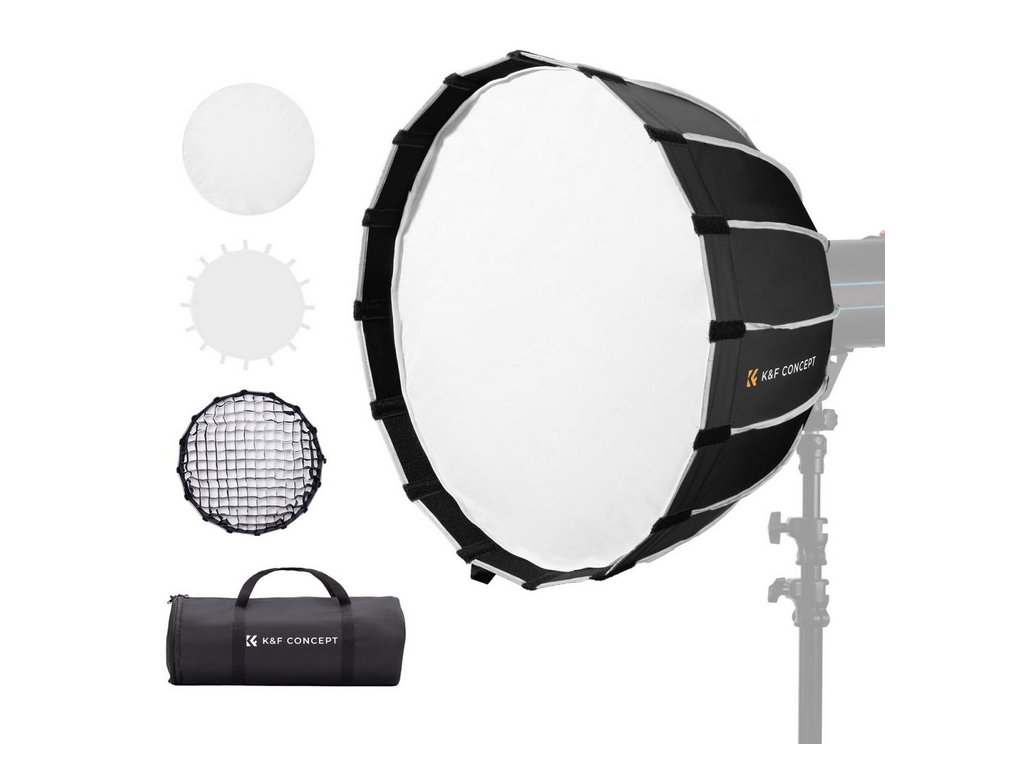 Softbox-ul parabolic cu eliberare rapidă K&F de 90 cm cu suport Bowens este conceput pentru a vă îmbunătăți fotografia și videografia cu o distribuție uniformă și uniformă a luminii. Acest softbox parabolic profund atenuează reflexiile ascuțite, elimină umbrele nedorite și păstrează reproducerea fidelă a culorilor. Structura sa de mandrină din aliaj cu eliberare rapidă și pliabilă economisește timp și energie, făcându-l mai eficient decât casetele soft tradiționale. Datorită celor 16 nervuri rezistente și elastice, își menține forma și durabilitatea perfectă chiar și după o utilizare extinsă. Grila și difuzoarele incluse în fagure permit controlul precis al luminii și efecte creative, făcându-l ideal pentru portrete, fotografie de produs, fotografie de frumusețe și modă, nunți și fotografii corporative.