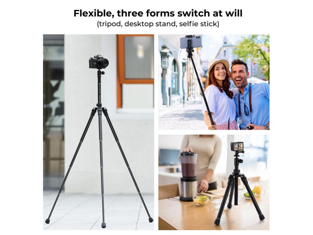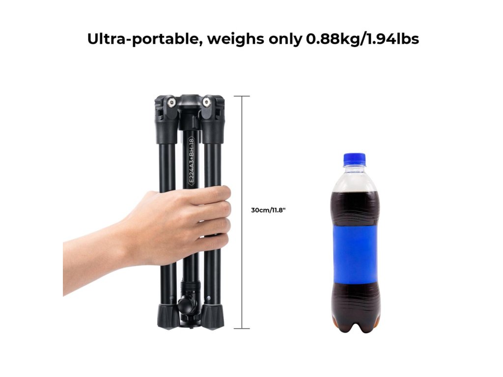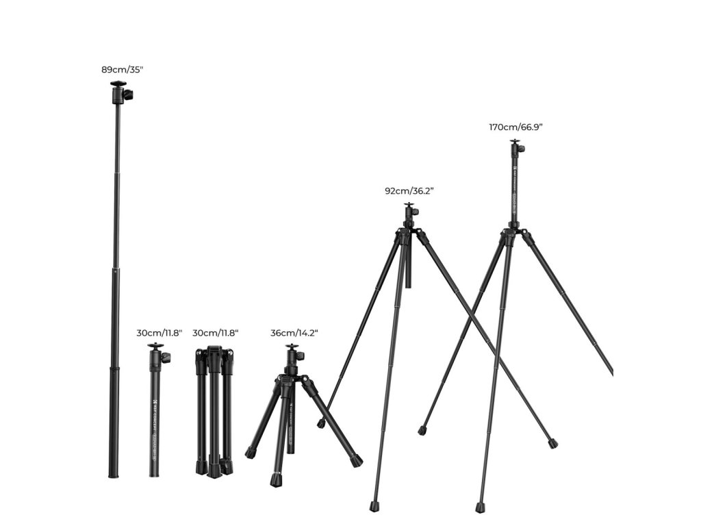 - * ?Super portabil pentru călătorii? Tubul cu 4 secțiuni poate regla înălțimea de lucru a trepiedului de la 36 cm/14,1 inchi la 170 cm/66,9 inchi în secunde; Lungimea pliată este de numai 30 cm/11,8 inchi și cântărește doar 0,88 kg/1,94 lbs, perfect pentru călătorii în interior/exterior.