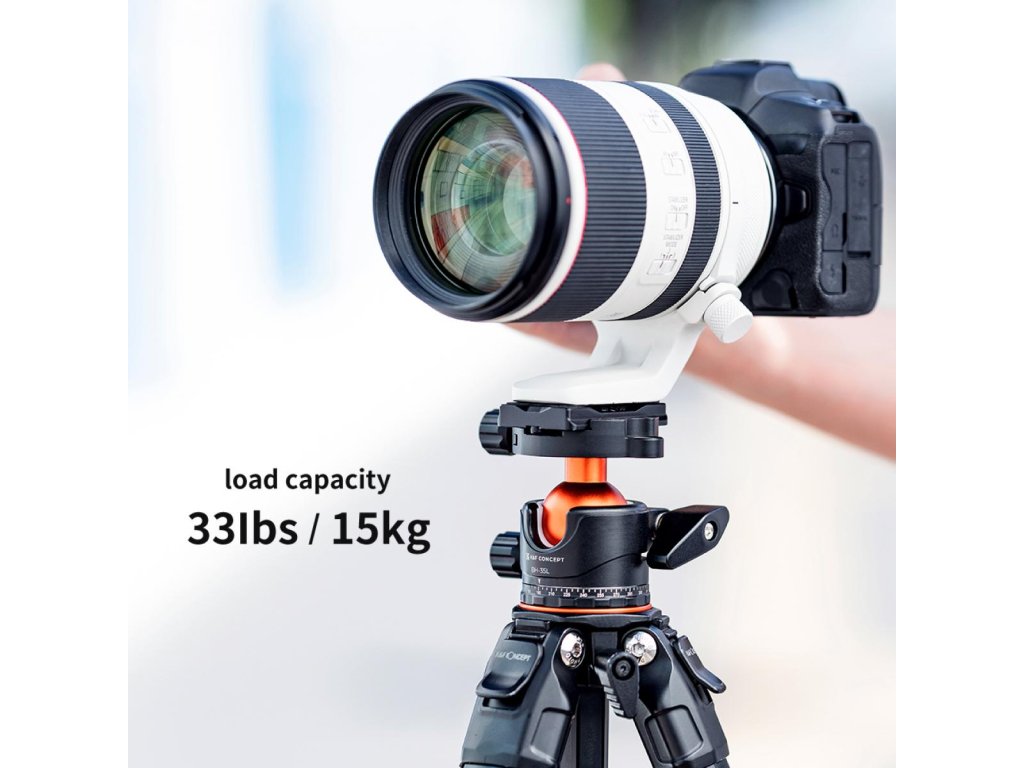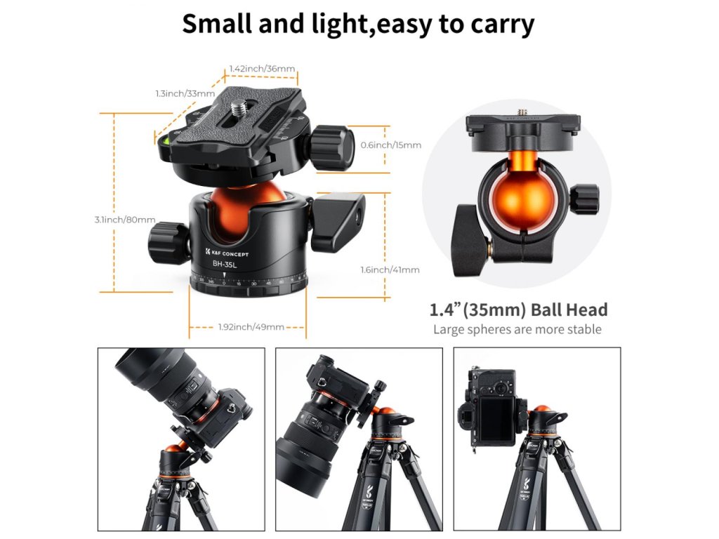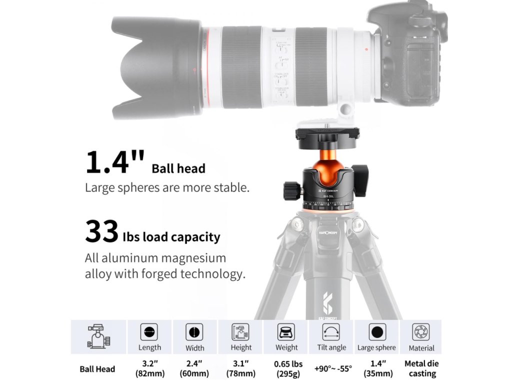 K&F Concept Professional 35 mm Trepied metalic Cap bilă 15 kg/33 lbs Sarcină Panoramă rotativă la 360° cu placă de eliberare rapidă K&F Concept-35 Series de 1/4 inch. 2 butoane cu șurub cu bile - Interval aproximativ de la +90° la -55° poate fi controlat rapid.