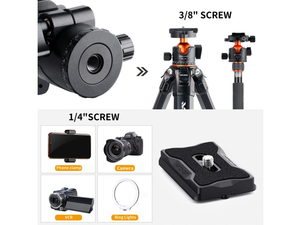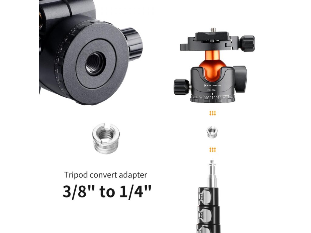 - * Compatibilitate largă - Capul sferic din seria K&F Concept KF-35 folosește șurub de 3/8" pentru a atașa trepiedele, în timp ce șurub de 1/4" pentru camere, suporturi pentru telefoane mobile, VCR, inel luminos. Este compatibil cu obiectivele zoom fără oglindă și DSLR-urile de pe piață.