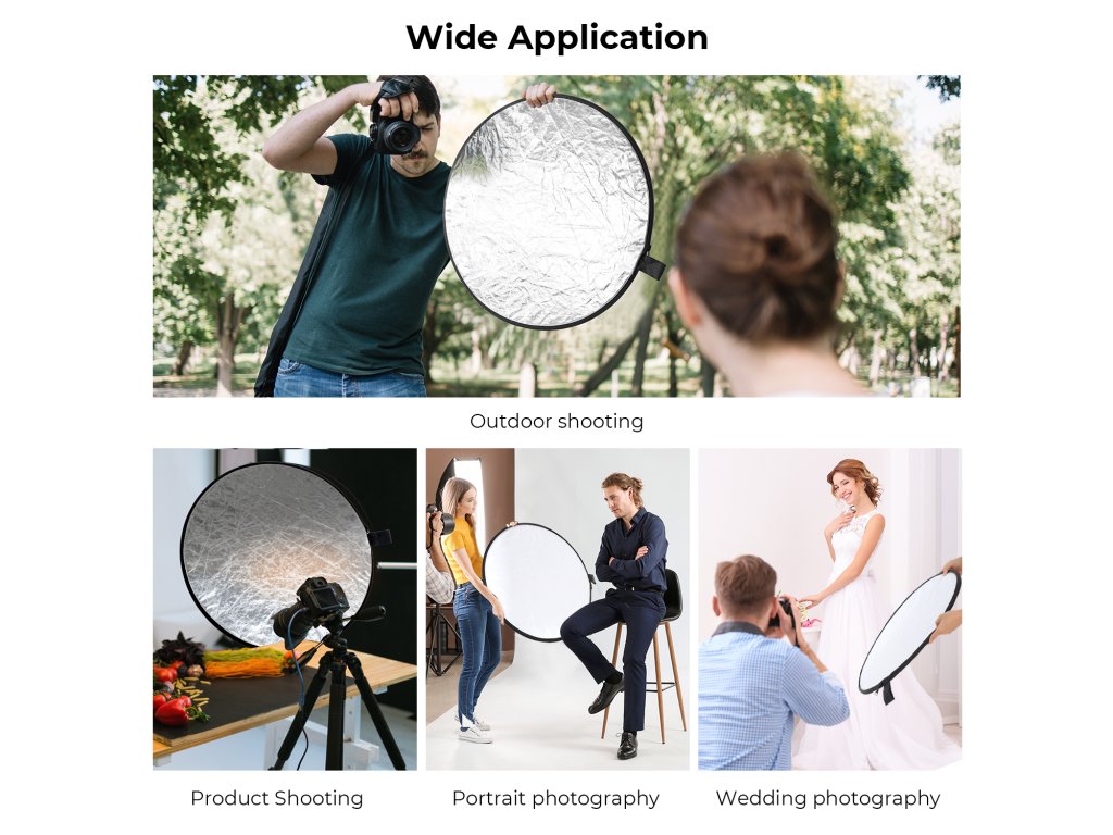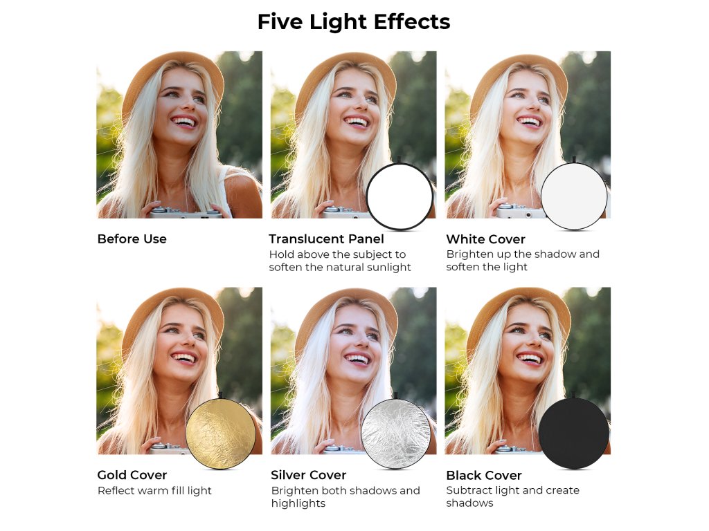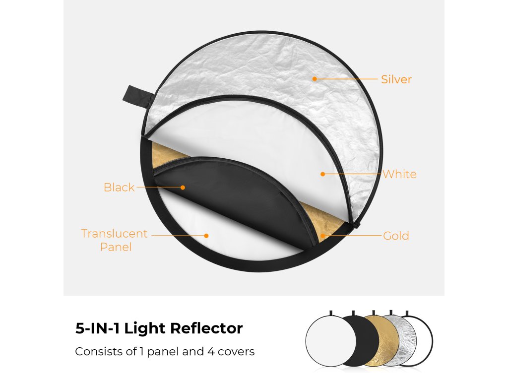 - Reflectori de lumină cinci în unu: auriu, argintiu, alb, negru și translucid, care oferă diferite efecte de lumină pentru fotografiile tale.