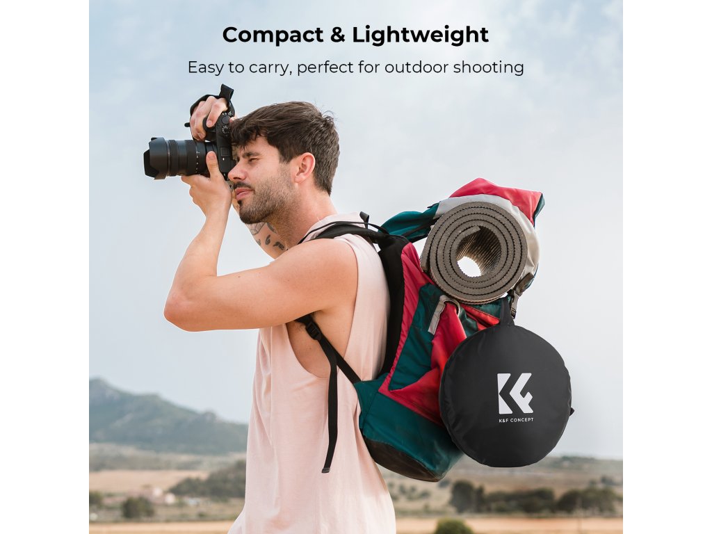 - Se pliază rapid pentru o portabilitate ușoară: reflectorul poate fi pliat rapid într-o dimensiune portabilă și vine cu un buzunar de mână pentru călătorie sau depozitare ușoară, ideal pentru fotografi în mișcare.
