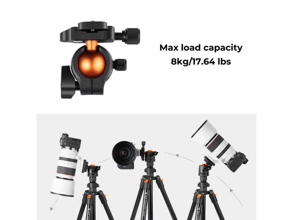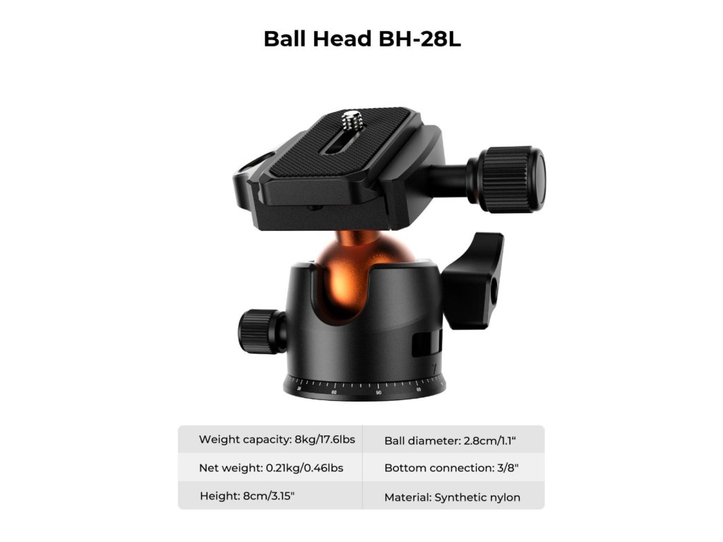 - * ?PANORAMA 360°? Capul sferic metalic mare de 28 mm al KF-28 oferă o capacitate de încărcare de 17,64 lbs/8 kg, poate fi rotit la 360 de grade, ceea ce ajută la extinderea domeniului de activitate al camerei DSLR în fotografierea panoramică.