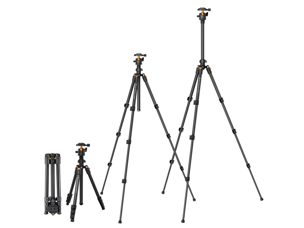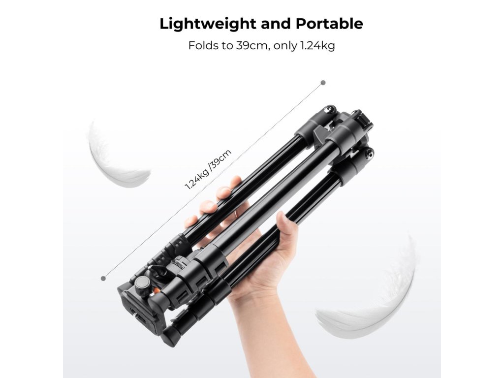 Trepied compact și portabil - ideal pentru călătorii, vloguri și muncă. Aliaj militar de calitate din magneziu și aluminiu, rezistență la coroziune; trepiedul cu cap sferic cântărește doar 1,16 kg, poate fi rotit la 180° și pliat la 390 mm/15,35", ușor de pus într-un rucsac sau valiză atunci când călătoriți.