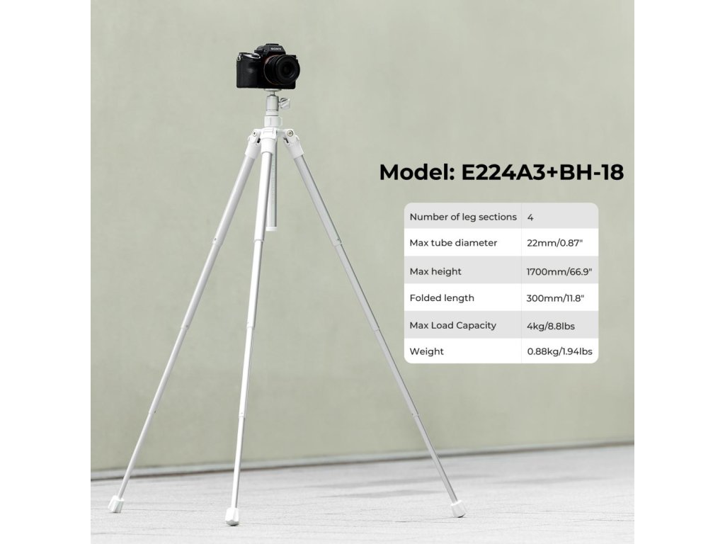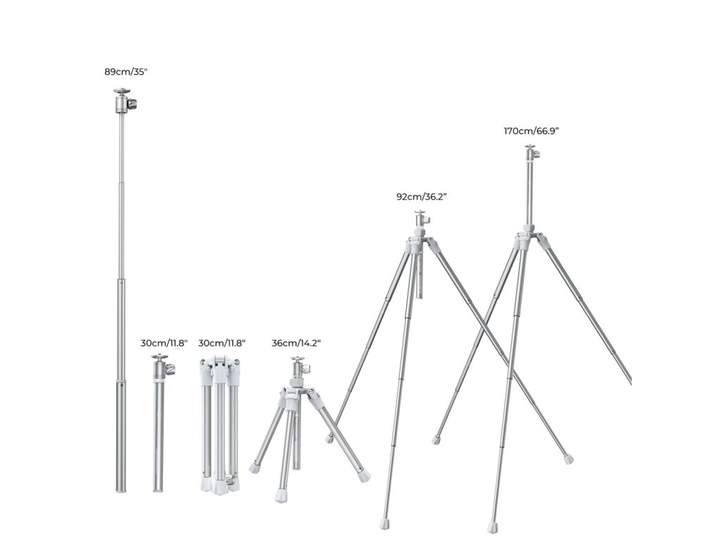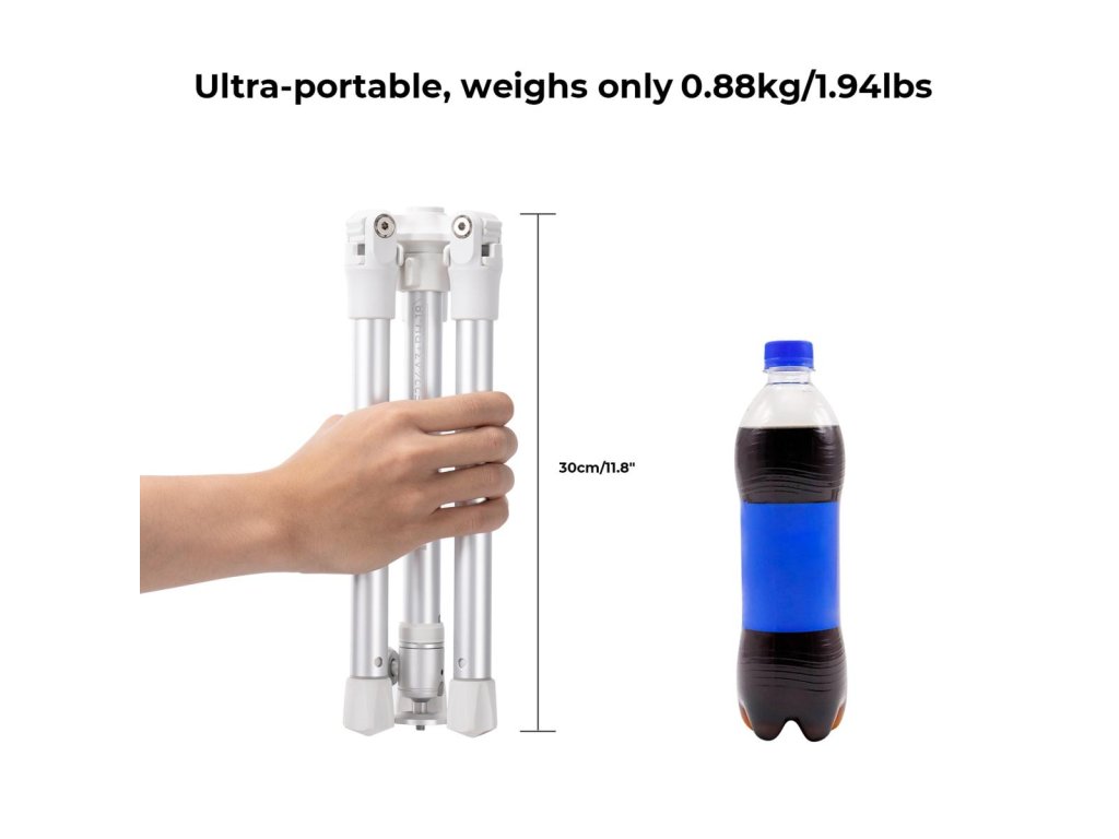 - * ?Super portabil pentru călătorii? Tubul cu 4 secțiuni poate regla înălțimea de lucru a trepiedului de la 36 cm/14,1 inchi la 170 cm/66,9 inchi în secunde; Lungimea pliată este de numai 30 cm/11,8 inchi și cântărește doar 0,88 kg/1,94 lbs, perfect pentru călătorii în interior/exterior.