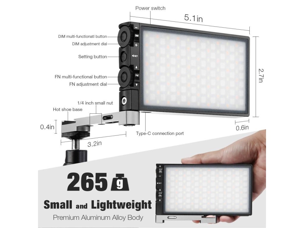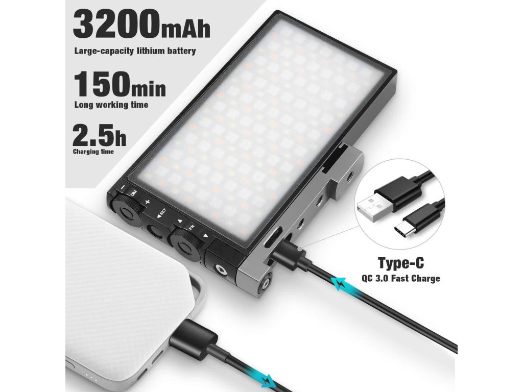 * [Caracteristicile produsului] CRI?97, TLCI?97, baterie reîncărcabilă încorporată de 7,4V 3200mAh, port de încărcare USB Type-C, poate fi încărcat complet în 2,5 ore și oferă 150 de minute timp de lucru la 100% luminozitate, timp de lucru Când luminozitatea este sub 100%, ar trebui să depășească 150 de minute.