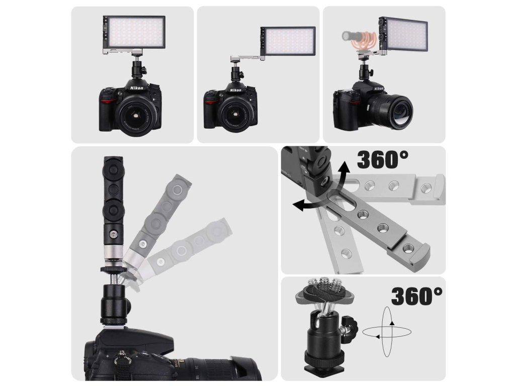 * [Braț rotativ cu picior de răcire] Panoul nostru de iluminat LED este echipat cu un braț rotativ la 360 de grade cu picior de răcire, care vă permite să instalați în același timp orice echipament cu un adaptor pentru pantof cald, cum ar fi un microfon pentru cameră, care este foarte convenabil pentru inregistrare.