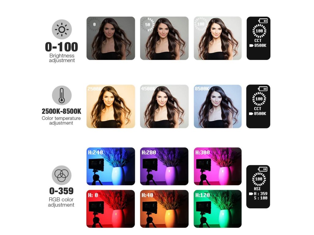 * [Nuanță, Saturație, Luminozitate, Temperatura de culoare reglabilă] Nuanța poate fi ajustată în intervalul 0 grade -359 grade; saturația culorii poate fi setată între 0%-100%; luminozitatea poate fi reglată de la 0% la 100%; Temperatura de culoare Reglabil de la 2500K (culoare caldă) la 8500K (culoare rece), afișajul LCD încorporat poate oferi date precise, permițându-vă să lucrați mai eficient