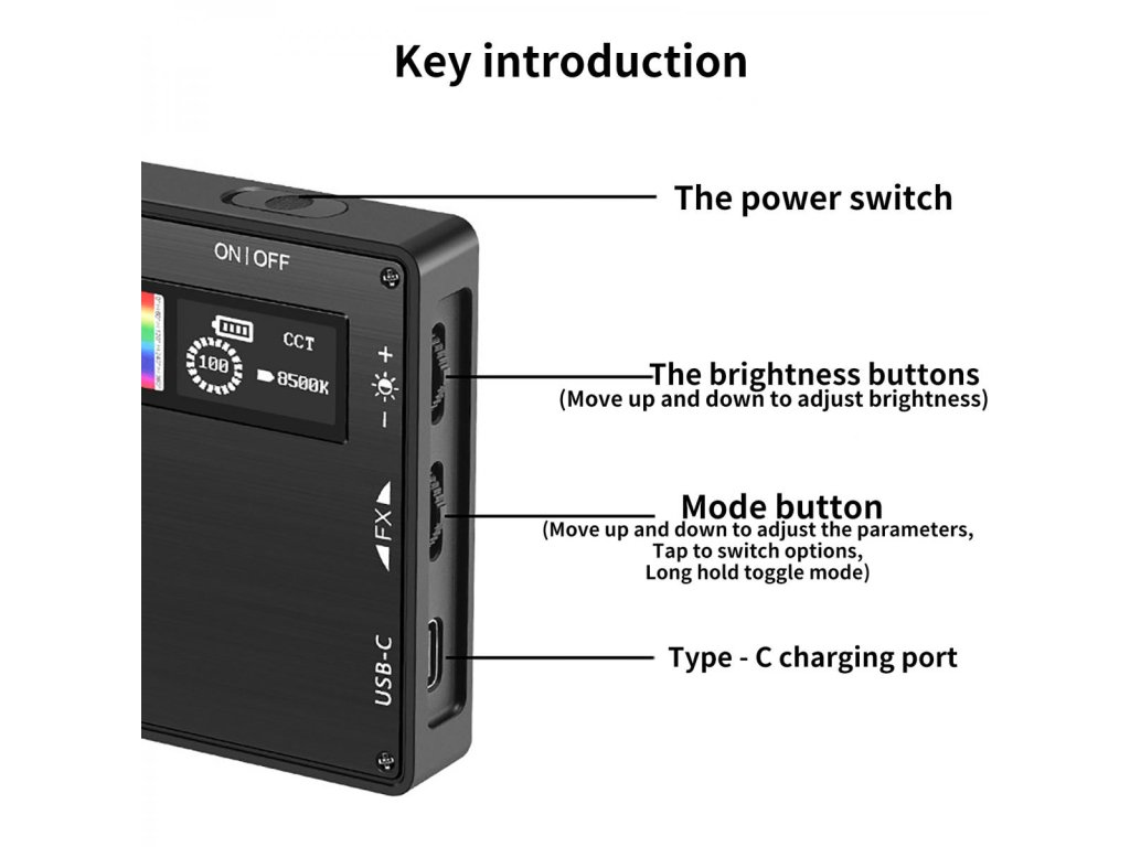 * [Caracteristicile produsului] CRI?97, TLCI?97, baterie reîncărcabilă încorporată de 7,4V 3200mAh, port de încărcare USB Type-C, poate fi încărcat complet în 2,5 ore și oferă 150 de minute timp de lucru la 100% luminozitate, timp de lucru Când luminozitatea este sub 100%, ar trebui să depășească 150 de minute.
