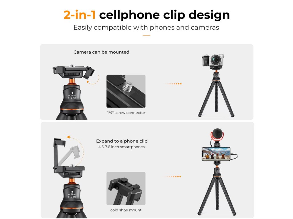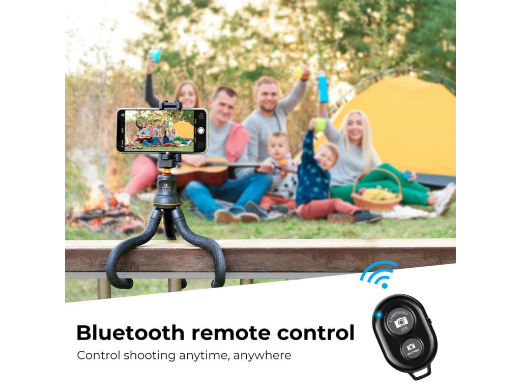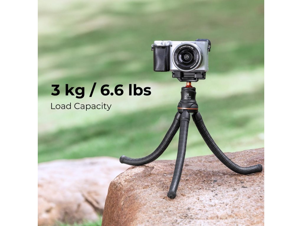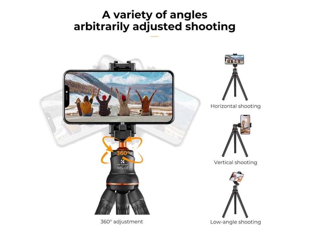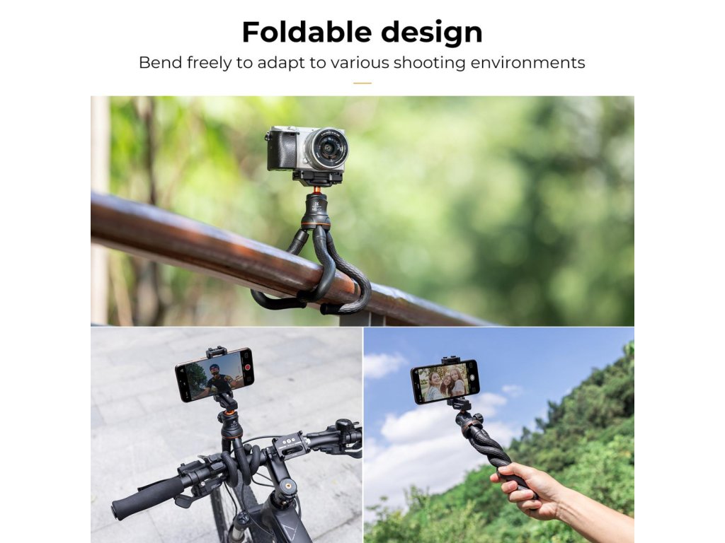 - * Picioarele flexibile pot fi indoite dupa bunul plac si instalate oriunde doriti, precum stalpi de lumina, balustrade, crengi de copac, biciclete sau scaune etc. Include suprafețe înclinate sau netede. Poate face fotografii clare ușor și rapid