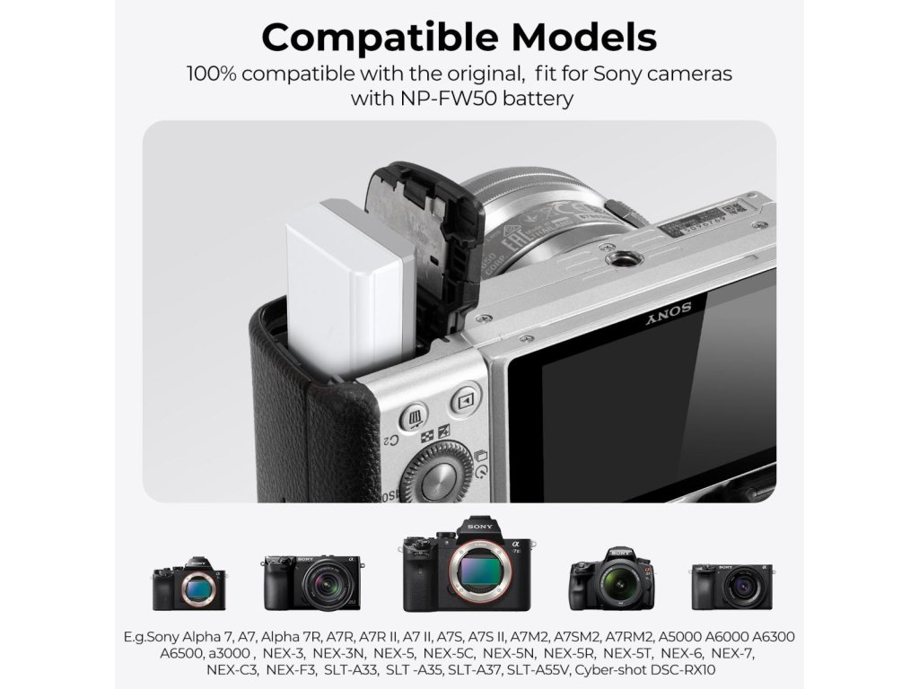 - * Capacitate puternică a bateriei. Baterie NP-FW50 USB-C cu baterie puternică de 1100 mAh care asigură înregistrare continuă peste 2,5 ore și fotografiere continuă peste 2500. Baterii de înaltă calitate fără efect de memorie.