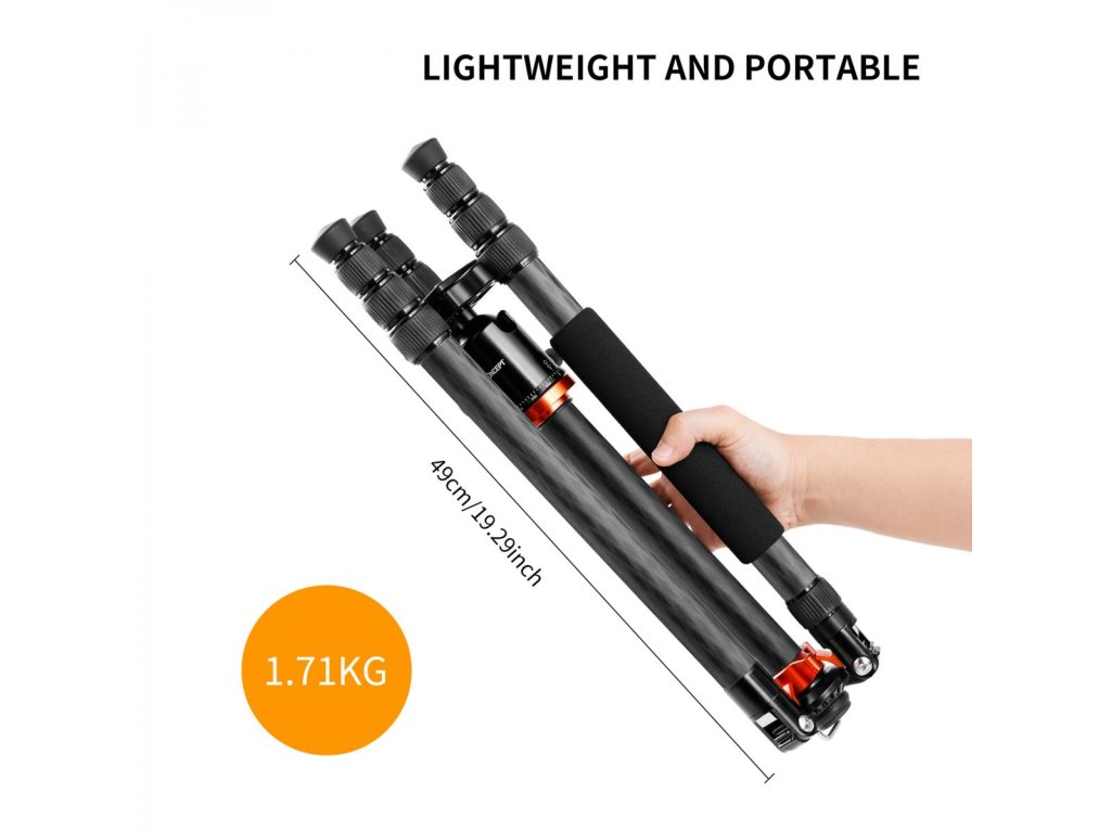 Trepiedul K&F Concept D284C2+BH-28 pentru cameră este fabricat din material din fibră de carbon de calitate pentru un suport mai puternic, mai rezistent la intemperii, coroziune și zgârieturi și, în general, mai puternic decât aluminiul. Cântărind doar 1,7 kg, acest tub trepied din fibră de carbon măsoară 490 mm în lungime atunci când este pliat, este super ușor și compact, cu o capacitate de încărcare de până la 22 lbs / 10 kg, făcându-l ideal atât pentru fotografia de interior, cât și de exterior.