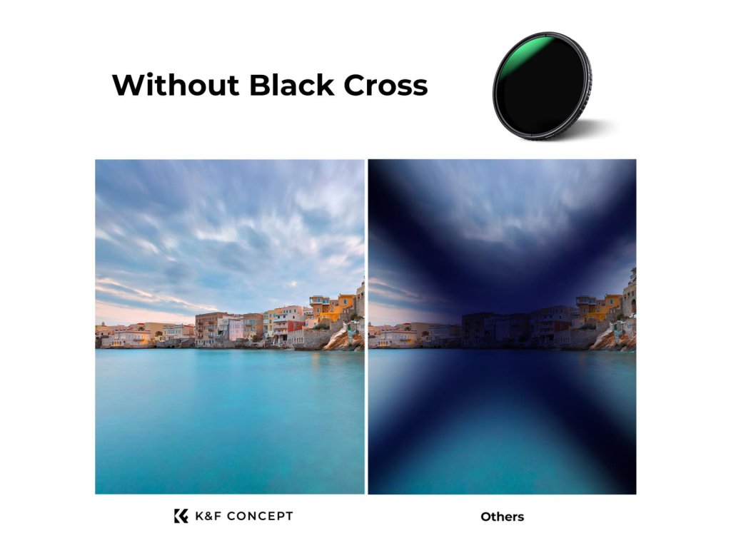 - ?Fără efect X? Cadrul de filtru ND variabil are un mecanism de blocare minim până la maxim și o valoare de scară pentru o reglare precisă. Filtrul poate fi rotit doar aproximativ jumătate din intervalul min-max fără a apărea X - această limitare se datorează fizicii. (fenomenul X este esențial pentru obiectivele cu unghi super larg în intervalul de 20 mm)
