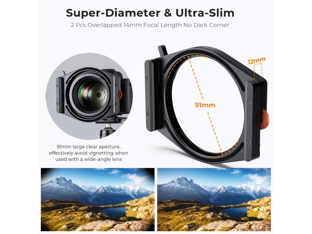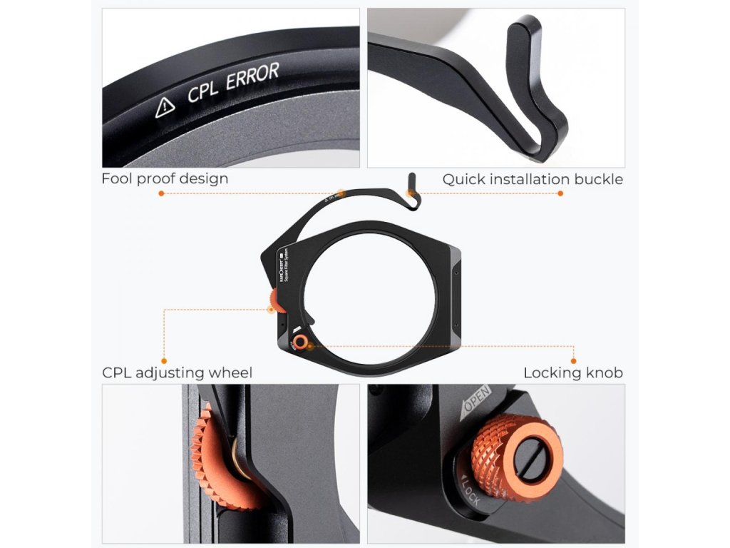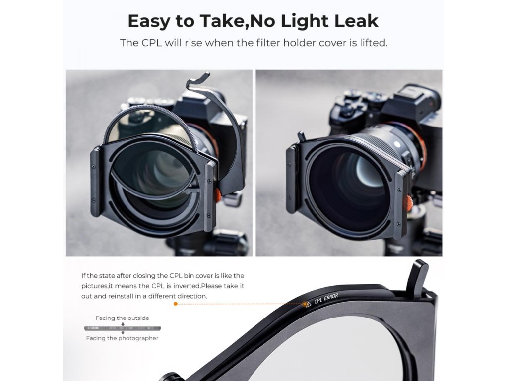 Cadru de filtru pătrat unic cu CPL de 95 mm, grosime suport de 12 mm, ușor de luat, fără scurgeri de lumină. Reduceți în mod eficient posibilitatea de vignetare atunci când utilizați un obiectiv ultra-larg. Cadrul ultra-subțire și diametrul mare asigură nicio vignetare pe obiectivul cu unghi larg și designul CPL din spate pentru instalare și demontare convenabilă.