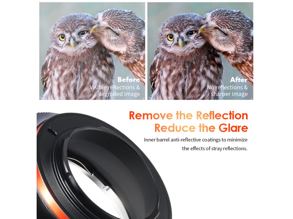 - * Transmisie perfectă de înaltă precizie, corp inel din aliaj de aluminiu și magneziu, baioneta fină de cupru nu va purta lentila, manopera este foarte excelentă, strâns și lin combinată cu baioneta, se concentrează, joacă funcția macro a lentilei și poate oferi infinit focalizare atentă.