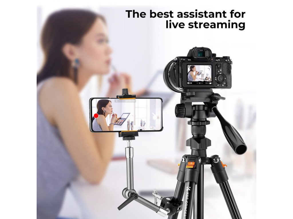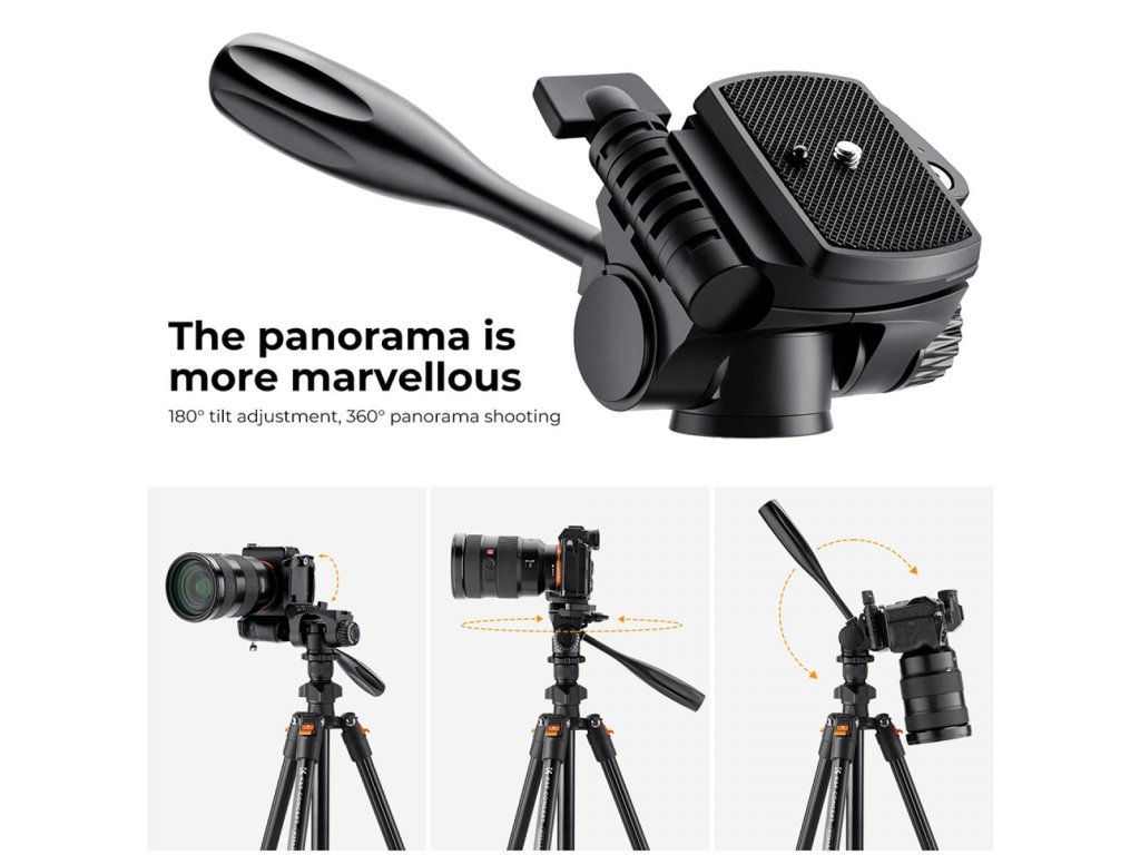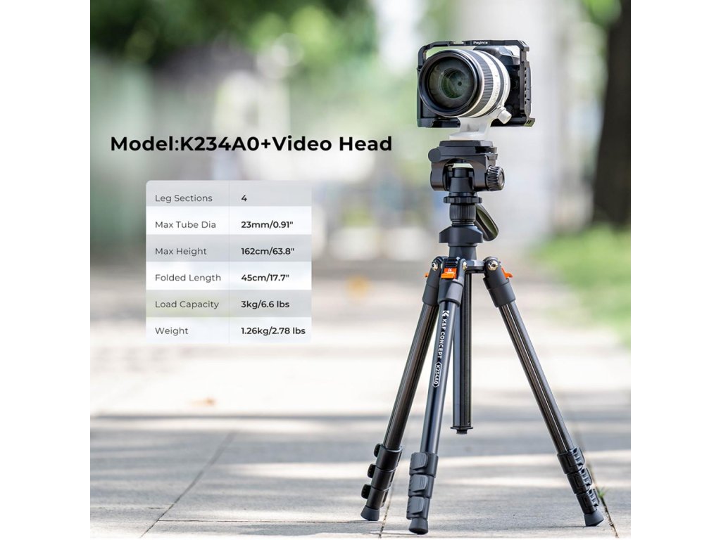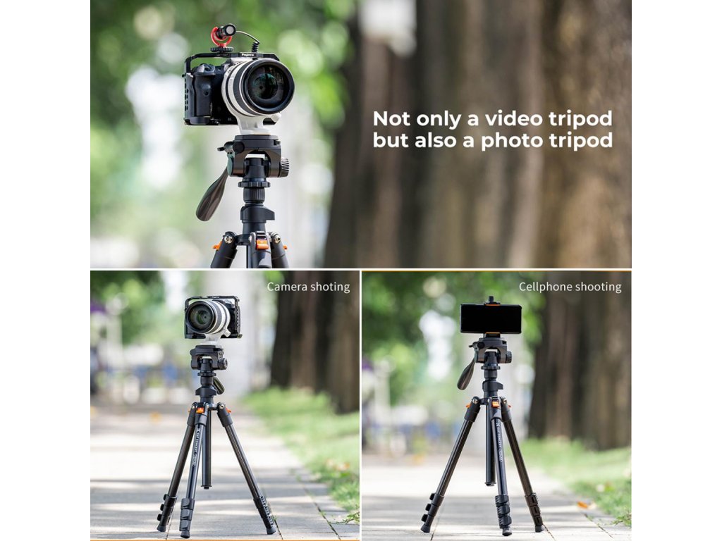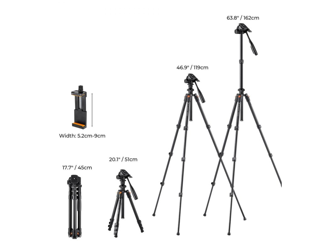 Acest trepied ușor și portabil K&F Concept cântărește doar 1,26 kg și măsoară doar 45 cm când este pliat, astfel încât poate fi așezat pe partea laterală a unui rucsac fără să ocupe spațiu. Este echipat cu picioare din 4 piese cu incuietori care va permit sa reglati inaltimea de lucru in cateva secunde. Include, de asemenea, o geantă de mână, un cap video și un suport pentru telefonul mobil.