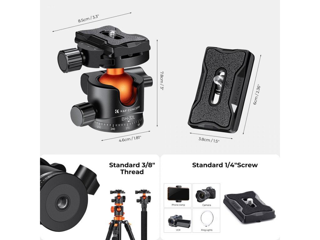- * Compatibilitate ridicată: placa de săniu rapidă de 1/4 inch este potrivită pentru camerele DSLR și camerele video, orificiul pentru șuruburi de 3/8 inch este pentru atașarea trepiedului, monopiedului, glisorului și a altor suporturi.
