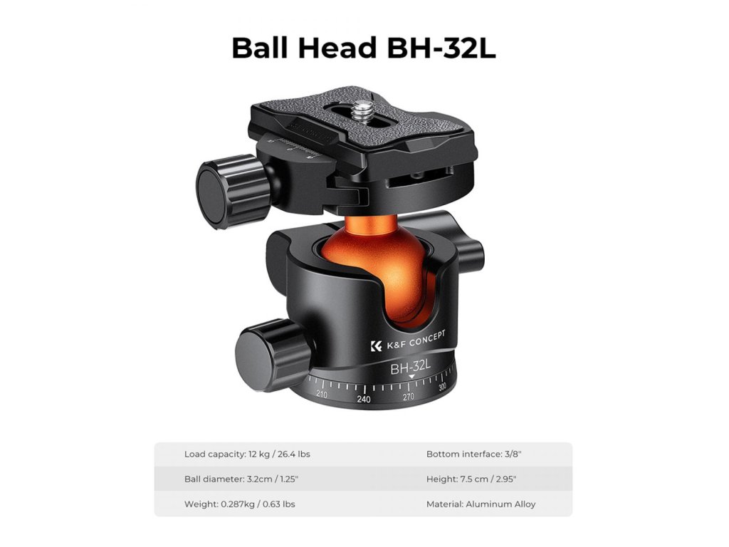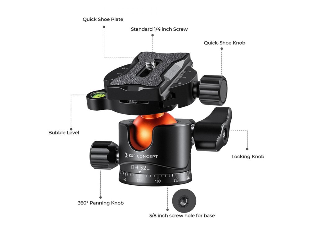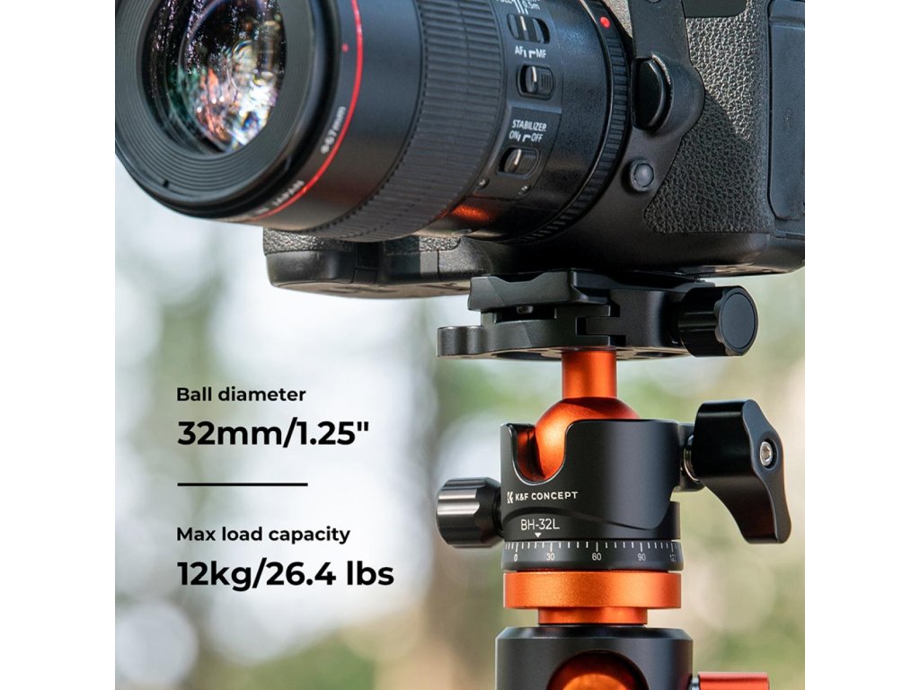 K&F Concept 32 mm Trepied metalic Cap sferic 360 de grade Pan pivotant cu placă de eliberare rapidă de 1/4 inch
