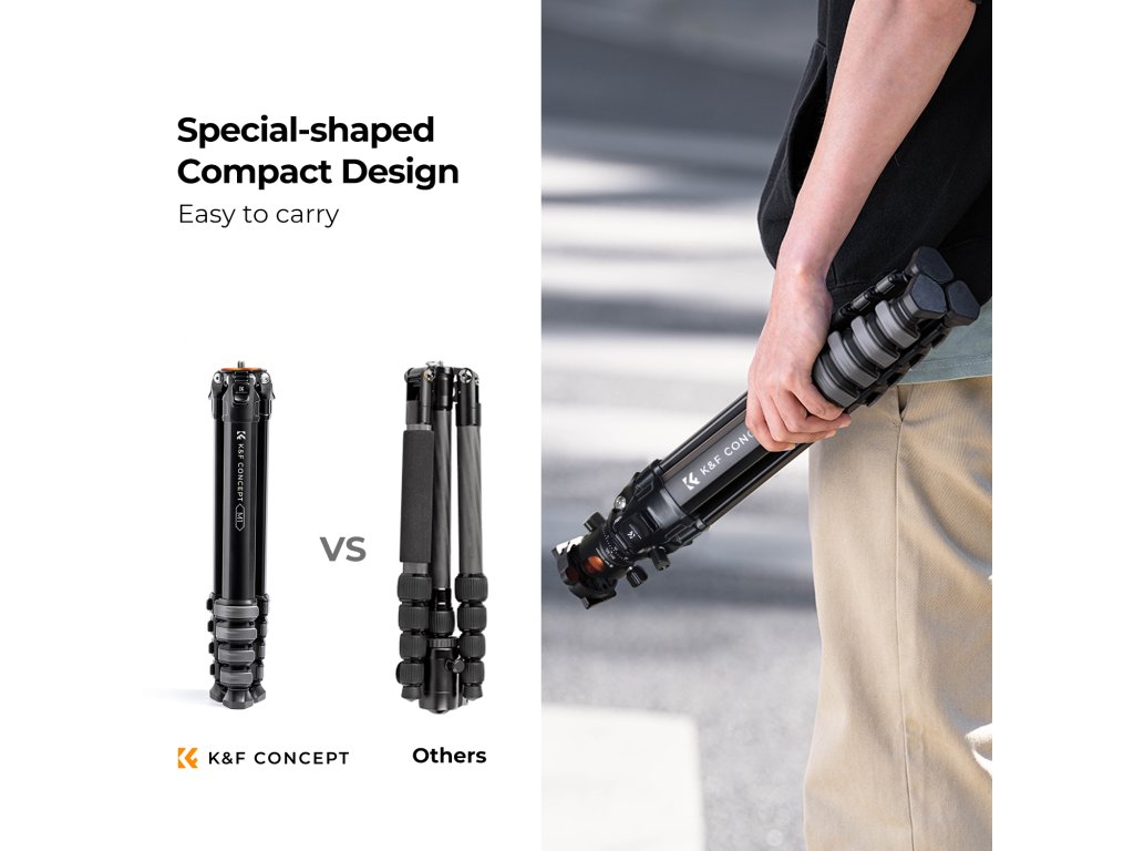 - * ?Design compact cu o formă specială? Trepiedul de călătorie din aluminiu K&F Concept Mutate Series are un corp compact și portabil, deoarece dimensiunea compoziției sale este mai mică de 500 mm/20" și ultra-ușoară la 1819g/4lbs. Diametrul compoziției este mai mic decât volumul apei obișnuite. Indiferent de călătorie și funcționează, designul compact al trepiedului îl face ușor de încărcat în orice geantă sau bagaj pentru cameră.