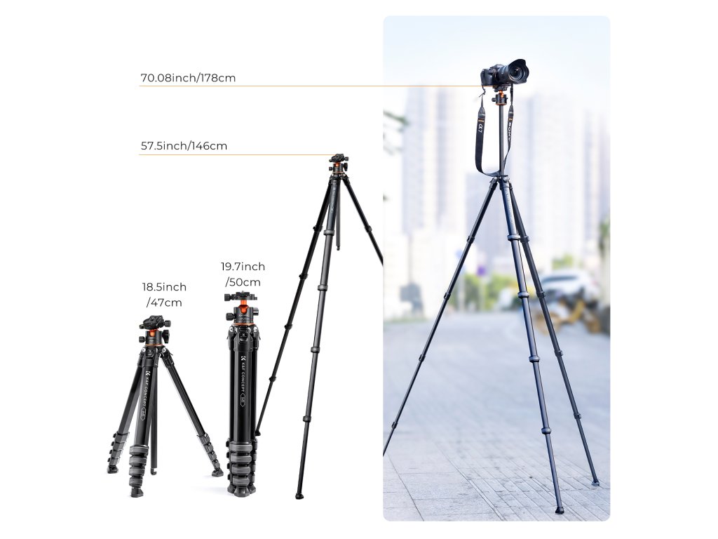 - * ?Portabil și flexibil pentru călătorii și muncă? Sistemul de răsturnare rapidă retrage picioarele din 4 piese la o lungime rezonabilă pliată de 20"/500 mm și se extinde de la o înălțime maximă de 70"/177 cm la 18"/460 mm. Cu o capacitate de încărcare de până la 15 kg/33,07 lbs, excelent stabilitate și caracteristici trepiedele bazate pe performanță răspund atât nevoilor profesioniștilor, cât și ale pasionaților.