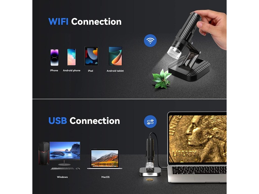 * Conectivitate WIFI și USB: acest microscop digital portabil fără fir se conectează nu numai la iPhone, iPad, telefonul și tableta Android prin wifi, ci și la computer pentru un câmp vizual mai mare cu un cablu de date USB care poate fi comutat la cerere pentru confort și inteligență mai mare.
