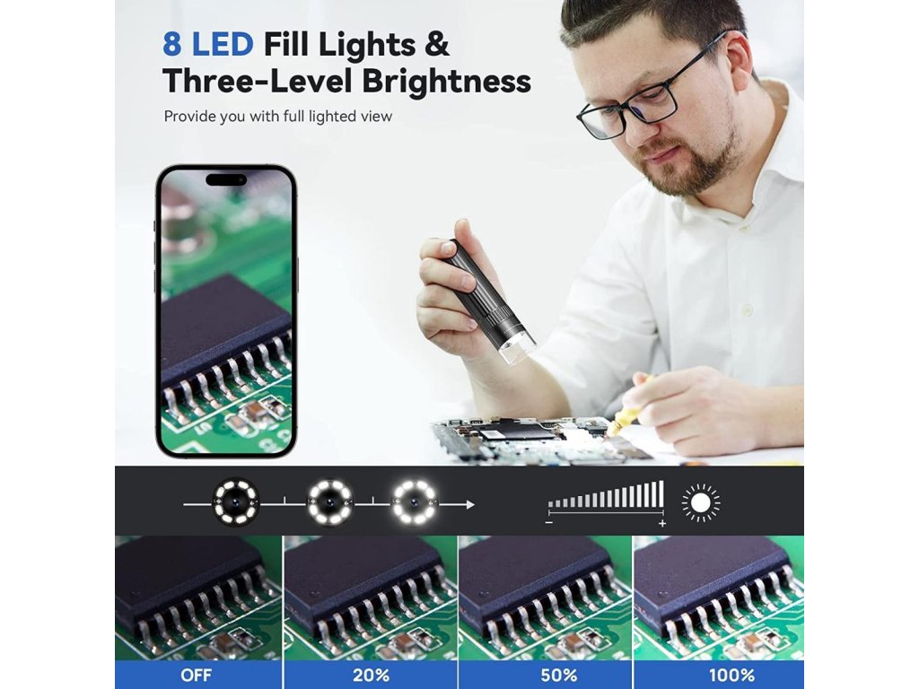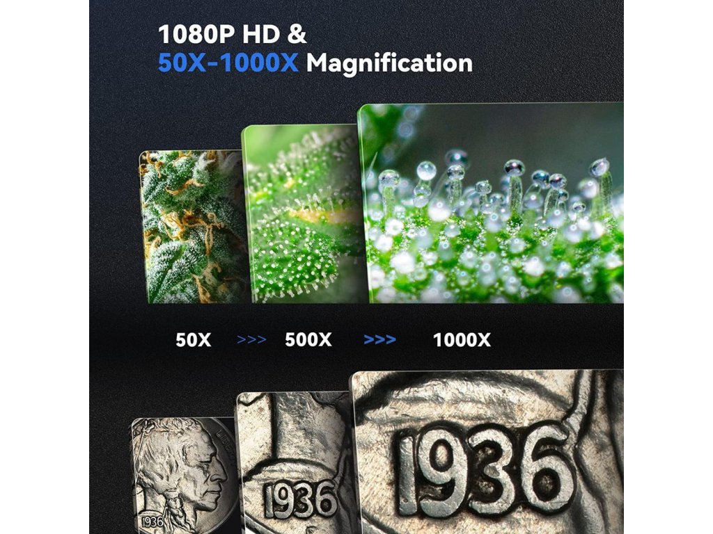 * Afișaj HD: cip CMOS de înaltă sensibilitate, HD de 2 megapixeli, video HD real 1920 * 1080P și afișare a imaginii de 2MP, transmisie wireless de mare viteză, fără întârziere a imaginii în timpul utilizării. Mărire 50x-1000x, 8 LED-uri încorporate, ajustare a luminozității în mai multe poziții pentru a controla lumina și întuneric după bunul plac, oferind o luminozitate incredibilă a detaliilor afișajului în condiții de iluminare completă.